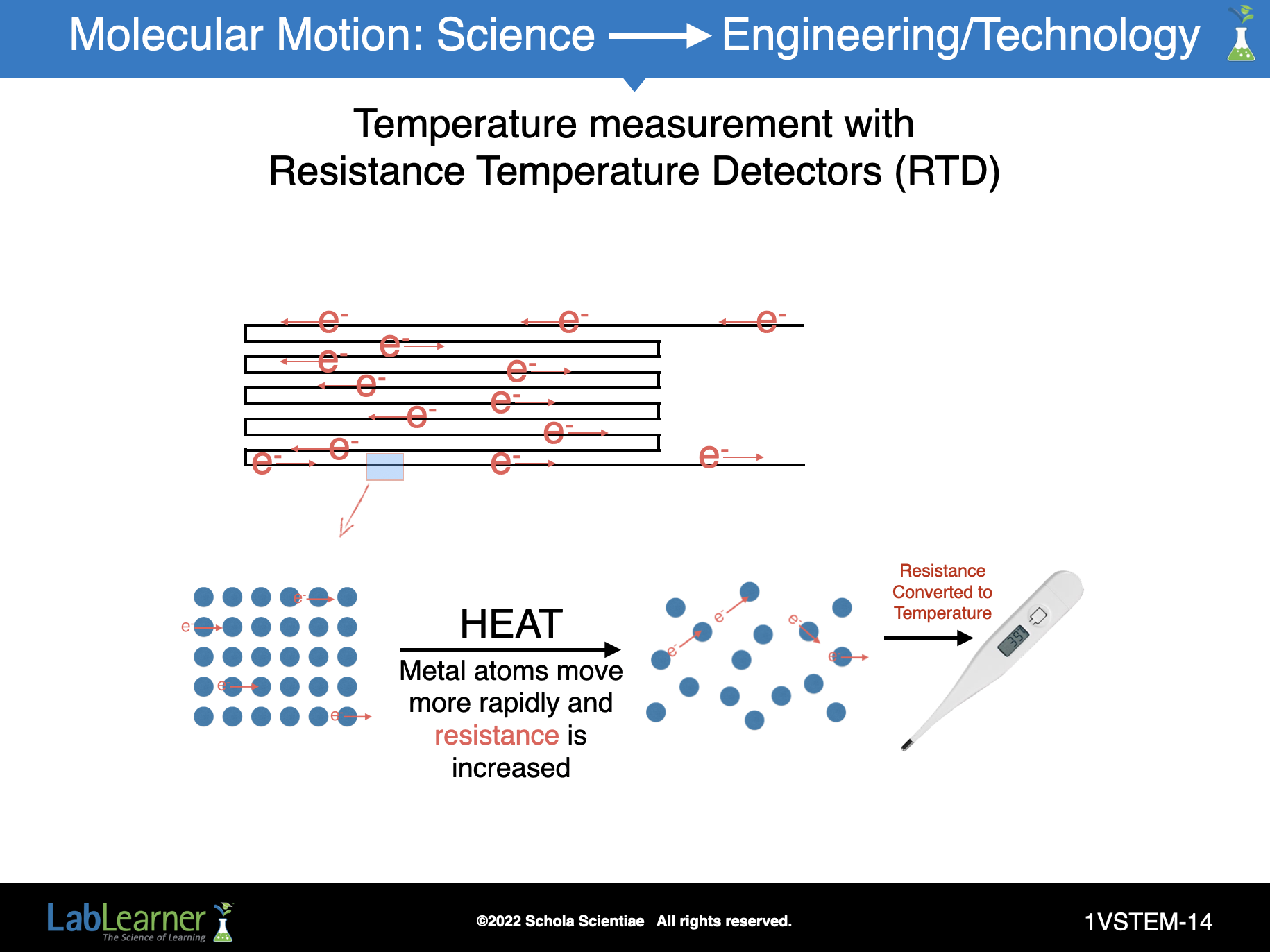 Just as we have discussed that the kinetic energy of heat cause atoms and molecules in liquids and gases to move faster and expand further apart, so is the case in the solid wire in the sensor. As the molecular motion of the metal atoms increases with temperature, the current electrons find it more difficult to move from one atom to the next, which causes the resistance in the wire to increase, much like the filaments in a lightbulb or resister causes a resistance to electron flow.