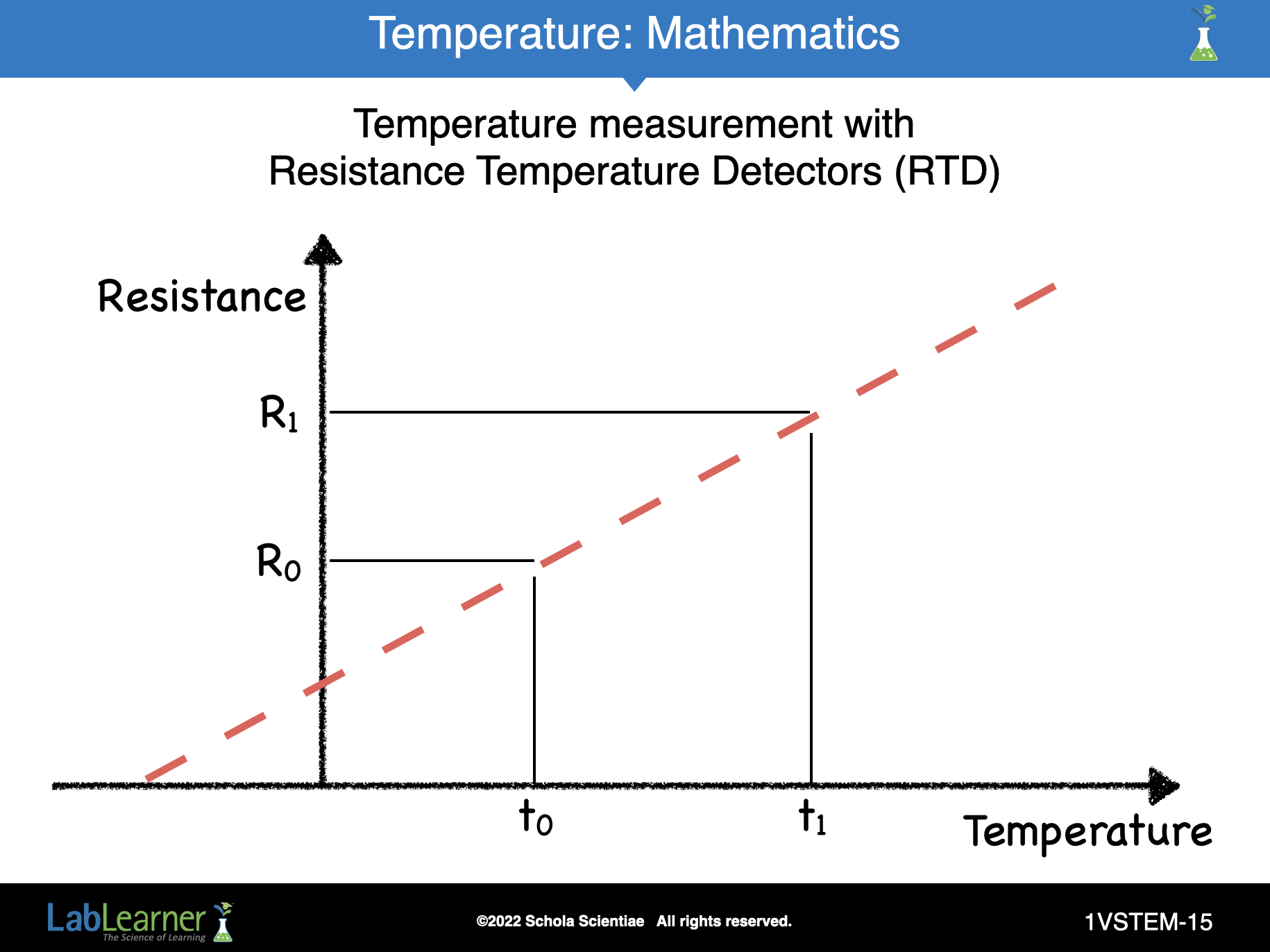 To calibrate the thermometer, the internal chip uses a mathematical relationship between resistance and temperature of the wire in the sensor according to the principle shown in the graph on this slide.