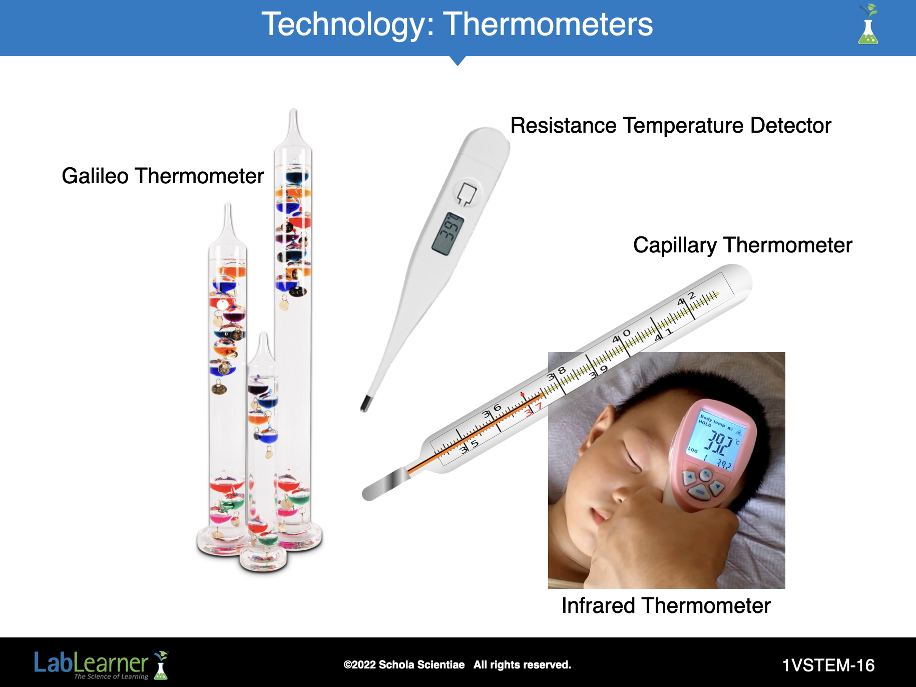 The girl pictured in this slide is using a Resistance Temperature Detectors (RTD) thermometer. This kind of thermometer is very commonly used today. Let’s see how science, technology, engineering, and mathematics have made it possible.