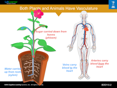 This slide shows that both plants and animals have a vasculature system to transport water and nutrients throughout their bodies. As noted on this slide, water taken up by plant roots is transported up and throughout the plant by vessels called xylem. Moving in the other direction, vessels called phloem carry sugar produced in leaves by photosynthesis down from the leaves and throughout the plant.