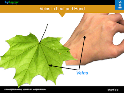This slide shows a close-up of a leaf and the back of the human hand. These two structures clearly show the underlying vasculature.