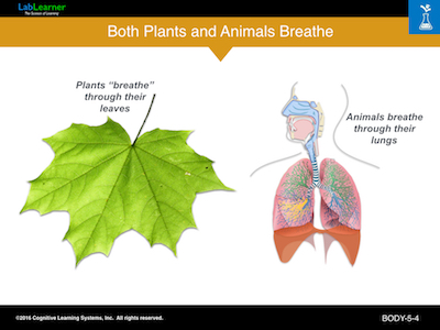 This slide points out that both plants and animals “breathe”. In animals, the lung is the major organ for breathing. The lung and associated structures in animals like humans are referred to as the respiratory system. Plants have a respiratory system as well. While humans breathe in oxygen and exhale carbon dioxide, plants do the opposite. They take in carbon dioxide and then produce oxygen through photosynthesis. The oxygen is released through small holes in the surface of lives call stomata.