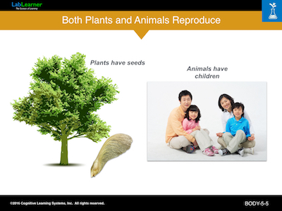 In this slide, we see that both plants and animals reproduce. Plants reproduce by producing seeds that, once fertilized, can grow into a new plant. Animals reproduce by producing eggs. Like plants, once fertilized an egg can grow into a new animal.