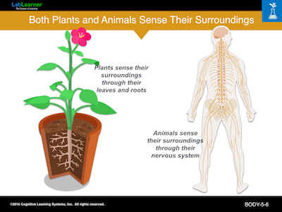 In animals, a nervous system, consisting of the brain and nerves, is used to sense the environment and respond to the animal’s surroundings.