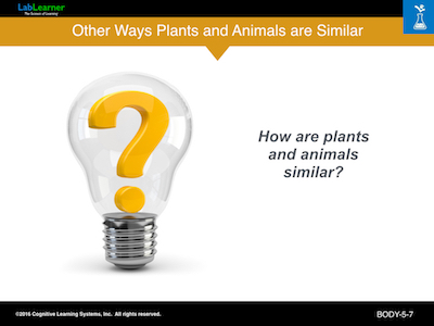 This final slide asks students to suggest other ways in which plants and animals are alike. The list is long but includes things like “they both grow”, “they both can move (animals more than plants)”, “they both eventually die”, “they both can be eaten by other animals”, etc.
