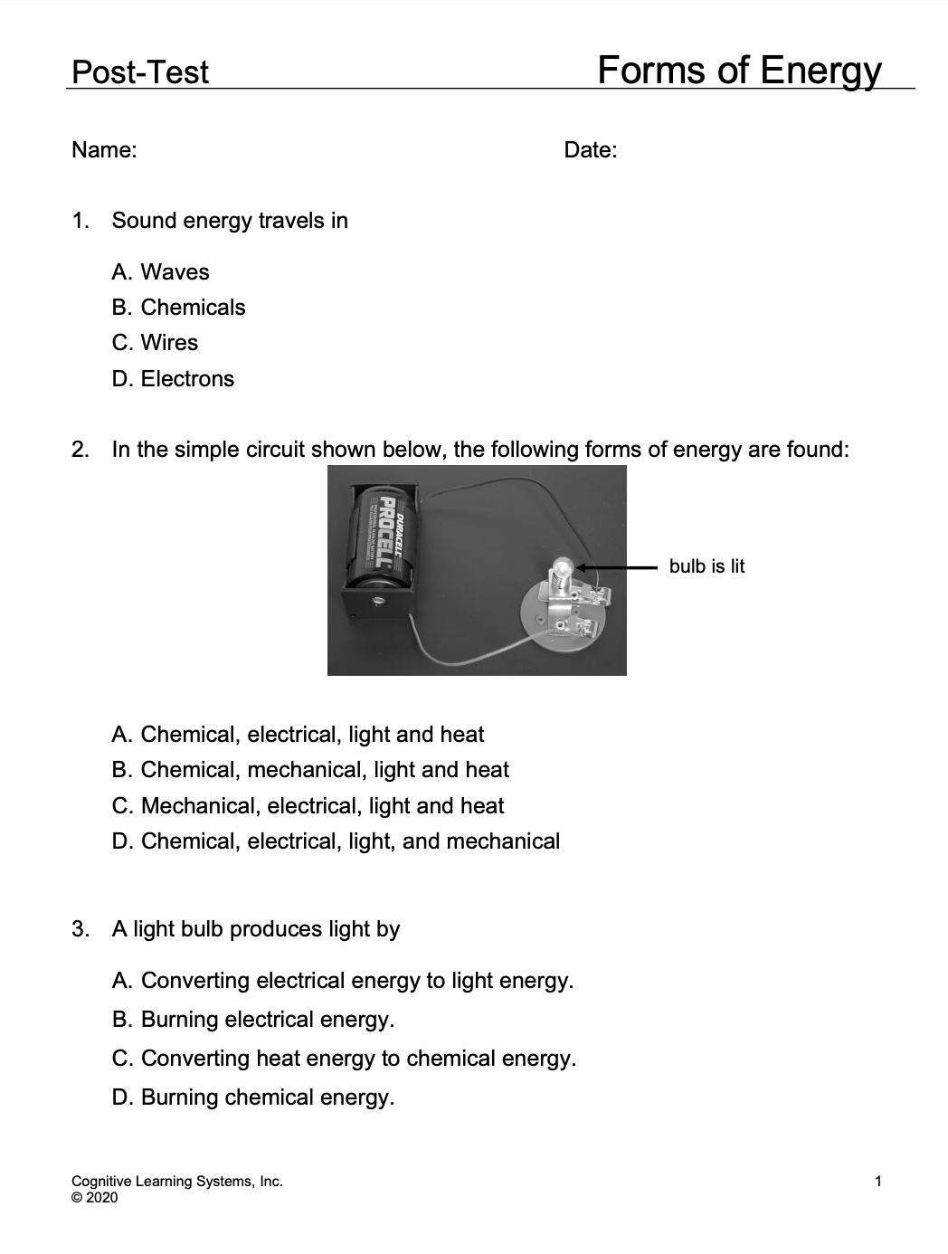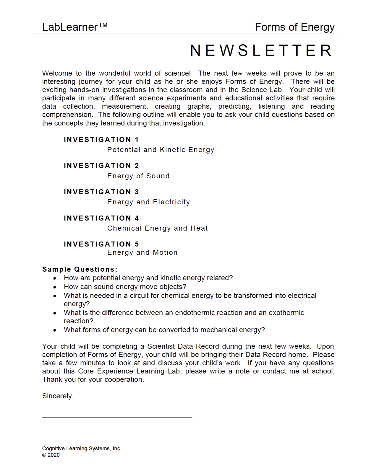 Investigation Six consists of a performance assessment designed to evaluate students’ understanding of the science concepts addressed in the first five Investigations of the CELL. During this exploration, students will use the knowledge they have gained about potential and kinetic energy, energy conversion, and five forms of energy: mechanical, heat, electricity, sound, and chemical.