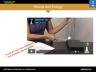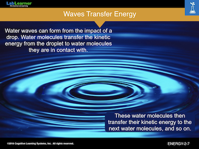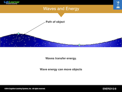 This slide shows that the energy of a wave of liquid contains energy and can cause other materials to move. In the video of this slide, the small light blue ball is seen to move both up and down with the wave, but also it is displaced and moves from left to right as a result of the wave action. Such up and down motion of waves may someday be used to produce electrical energy.