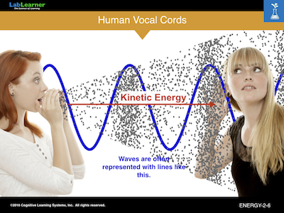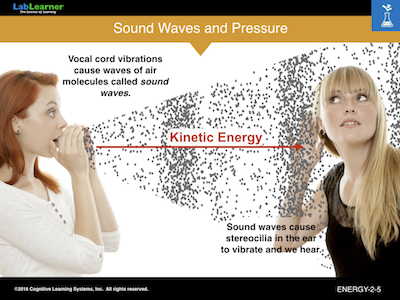 This slide shows an overview of the whole process of initiating and perceiving sound waves. The important concept of this slide is that the disturbing of air molecules by vocal cord vibrations pass through the air as waves of vibrating air molecules. The entire process involves kinetic energy because all of the steps involve the movement of matter (vocal cords, air molecules, eardrum, and stereocilia).