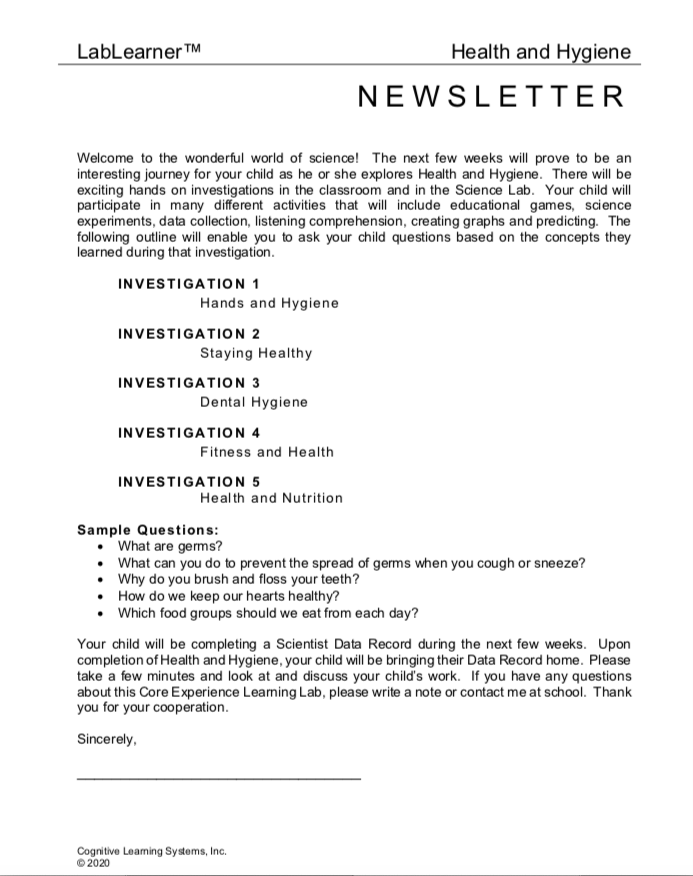 During this CELL, students will conduct several investigations focused on exploring their health and hygiene. Students will investigate the proper ways to care for their bodies. As they perform these investigations, students will practice ways in which they will remove the most germs from their bodies and prevent germs from spreading. Students will develop an understanding of the importance of keeping their hearts healthy by diet and exercise. Through these investigations, students will develop both their observational skills and their understanding of health and hygiene.