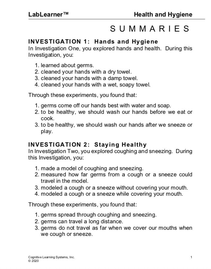 In Investigation One, students will be introduced to the concepts of health and hygiene. Through the use of models and diagrams, students will develop a beginning understanding of how poor hygiene promotes the spread of bacteria and germs. In addition, they will learn how to properly wash their hands.