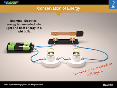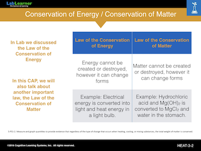 In this short CAP, we wish to talk about both the Law of Conservation of Energy and the Law of Conservation of Matter. At this point, the thing that we would like students to appreciate is that neither energy nor matter can be destroyed or created. When energy or matter appears to disappear it is only that they have changed form, but the exact same amount of energy and matter will always exist regardless of what form transitions have taken place.