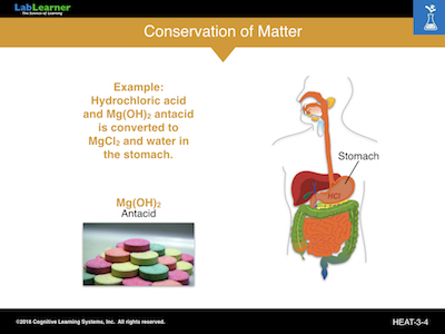 This is the first of three slides devoted to the Law of Conservation of Matter. This law states that matter cannot be created or destroyed, but can change form. The example we are using is that of an antacid tablet composed of magnesium hydroxide Mg(OH)2. Stomach acid, hydrochloric acid or HCl, is secreted by cells lining the inside of the stomach to aid in the digestion of food. Sometimes too much acid causes stomach problems. While modern drugs target the release of HCl, an antacid is used to neutralize the acid in the stomach once it is already present.