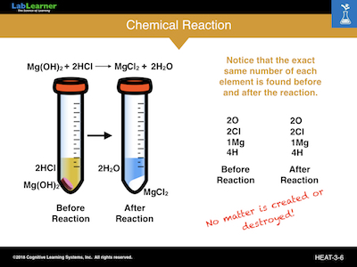 In the experiment shown in this slide an antacid tablet, composed of the chemical magnesium hydroxide Mg(OH)2, is added to a certain volume of hydrochloric acid (HCl). Hydrochloric acid is an acid secreted by the stomach lining to help break down and digest food. As seen in the slide, the total mass of the acid and antacid tablet is 31.5 grams. After the reaction is complete, the antacid and hydrochloric acid have been completely transformed into two new products magnesium chloride (MgCl2) and water (H2O). IMPORTANTLY, the mass of the two products is EXACTLY the same as the two starting materials, 31.5g. Thus, although the composition of the reaction changed completely, there was no increase or decrease in mass. Therefore, matter was neither created nor destroyed as a result of the reaction.