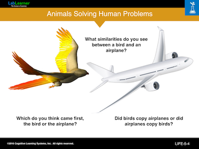 This slide depicts the second example of a human invention that mimics the natural structure of an animal body. In addition, the same three questions asked in the previous slide are asked again, this time for the bird/airplane comparison.