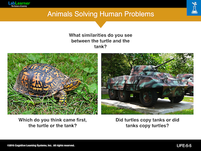 This is the first of three very similar slides in which an animal structure is compared to a human invention mimicking it. When viewing this slide, first we will ask students to identify similarities between the animal structure(s) and the human invention that mimics it. Next (lower left), we ask students which they think came first, the animal structure or the human invention. This seemingly obvious question may not initially be clear to students. However, they should begin to understand the time sequence involved with more examples. Finally, we ask students if the animal in question “copied” the human invention or if the human invention copied the animal structure. Again, the repetition of this and the next two nearly identical slides will serve to inform students of this important relationship between natural animal structures and human inventions.