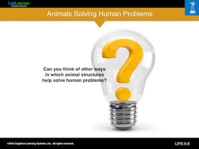 This slide simply asks students, “How do you think we can solve human problems by studying animals?”. Students have probably never thought of this question before. Hopefully, after observing a few examples of how humans have designed inventions mimicking animal structures, they will be able to think of additional examples on their own.