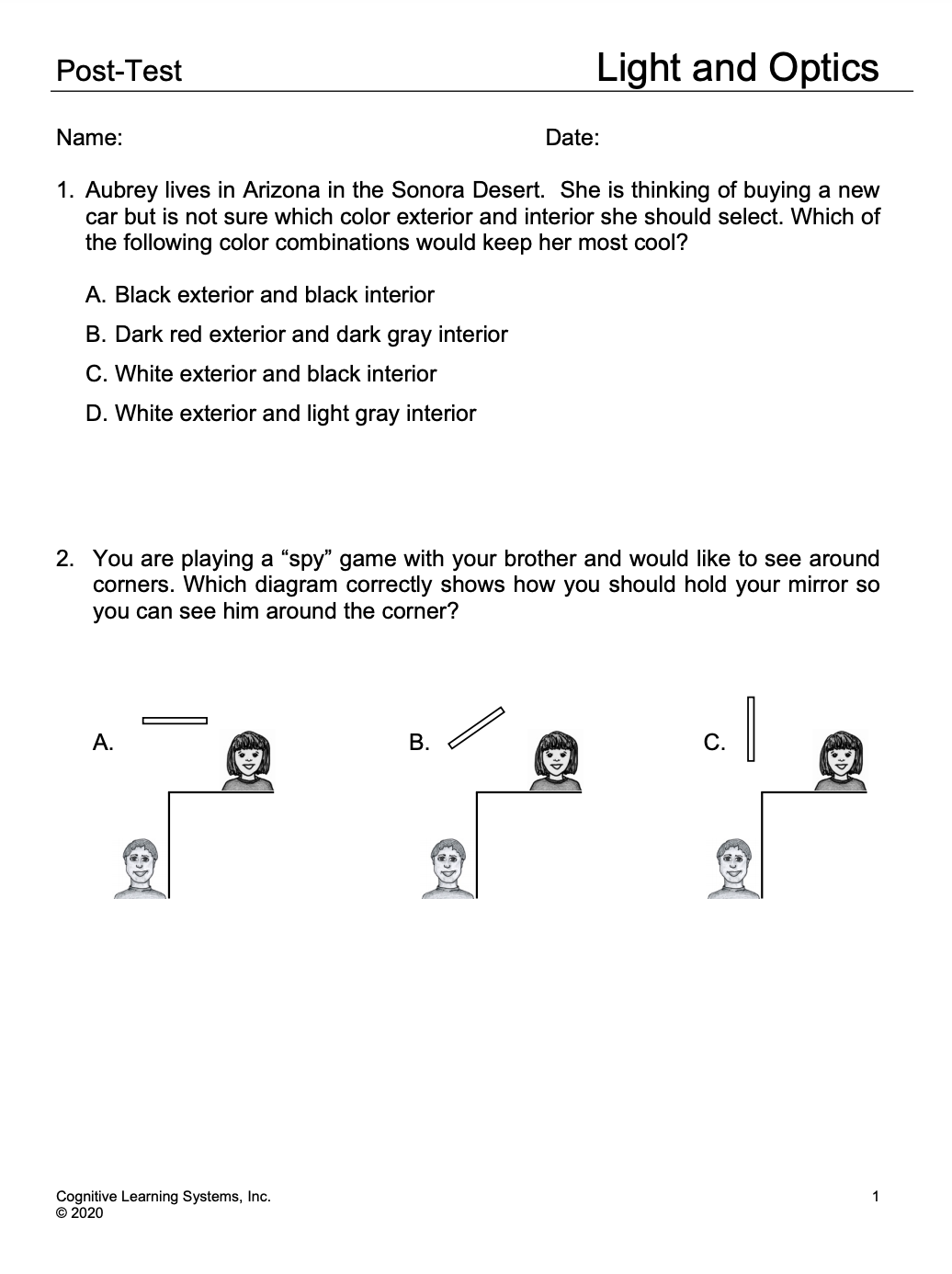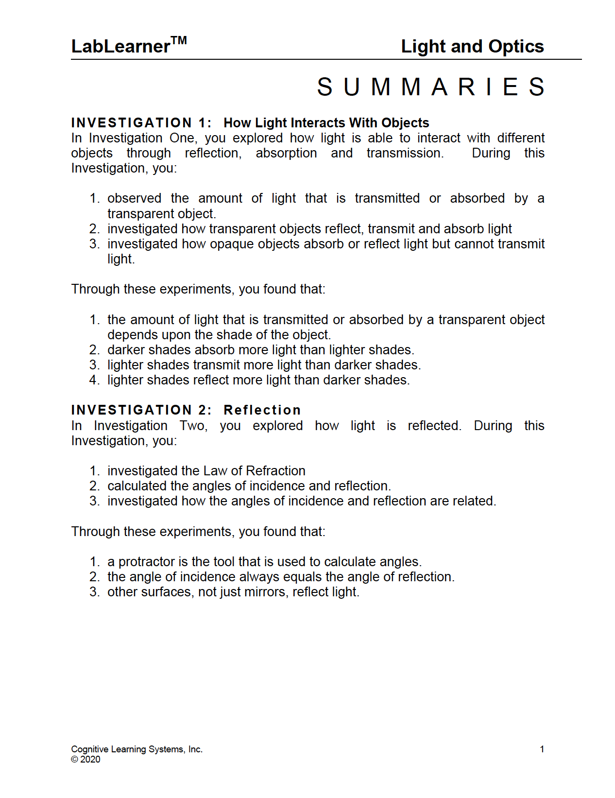 During this CELL, students will conduct several Investigations that deal with light and optics. Students will investigate how transparent objects interact with light to both absorb and transmit light. It will become evident that there is an inverse relationship between absorption and transmission since light that is not transmitted by a transparent object is absorbed. Students will investigate how opaque objects interact with light to both absorb and reflect light.