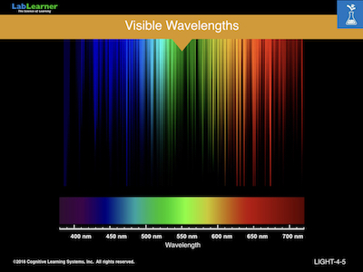 This colorful slide focuses on just the visible region of the electromagnetic spectrum. Depending on the wavelength, we perceive different colors. The visible wavelengths range from purple at around 400nm to red at 700nm.
