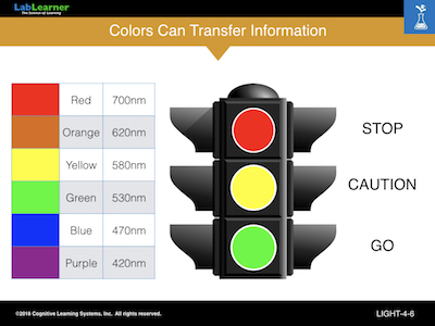 This slide and the following slide illustrate ways in which the wavelength of visible light can be used to communicate meaning or transfer information. The common traffic signal uses three different colors; red, yellow, and green. Most all students will recognize this form of communication with color. Red means stop. Yellow means caution. And green means go.