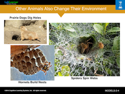 This slide and the following slide are simply to demonstrate that other animals change their environment to meet their needs. Here we see a prairie dog that has dug a hole or burrow, a spider’s web, and a hornet nest. The spider web serves as protection for the spider but also as a trap for catching insects for food. The hornet nest protects eggs and larvae until they mature.