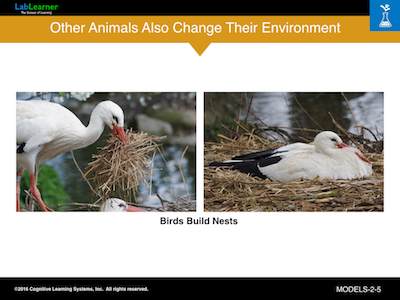 This slide shows that birds change their environment by building nests from various materials. Students will likely be most familiar with this form of environment modification by animals.