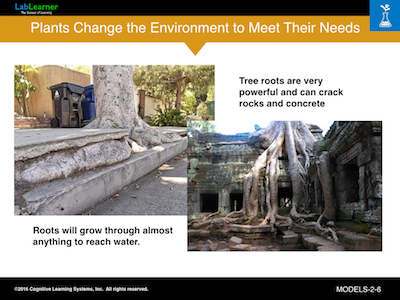 This slide shows that plants modify their environment to suit their needs as well. Most students have seen how tree roots displace or crack concrete sidewalks. Plants change their environment in many other ways but most of them involve invisible chemical reactions that young students need not be concerned with at this time.