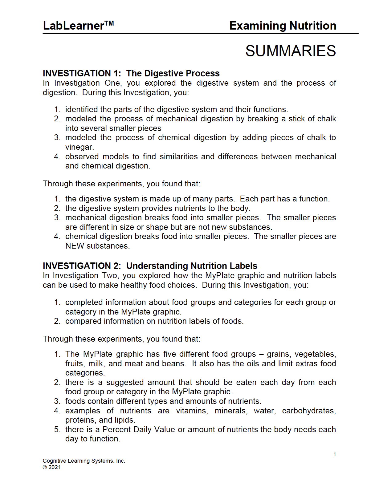Investigation 1: The Digestive Process