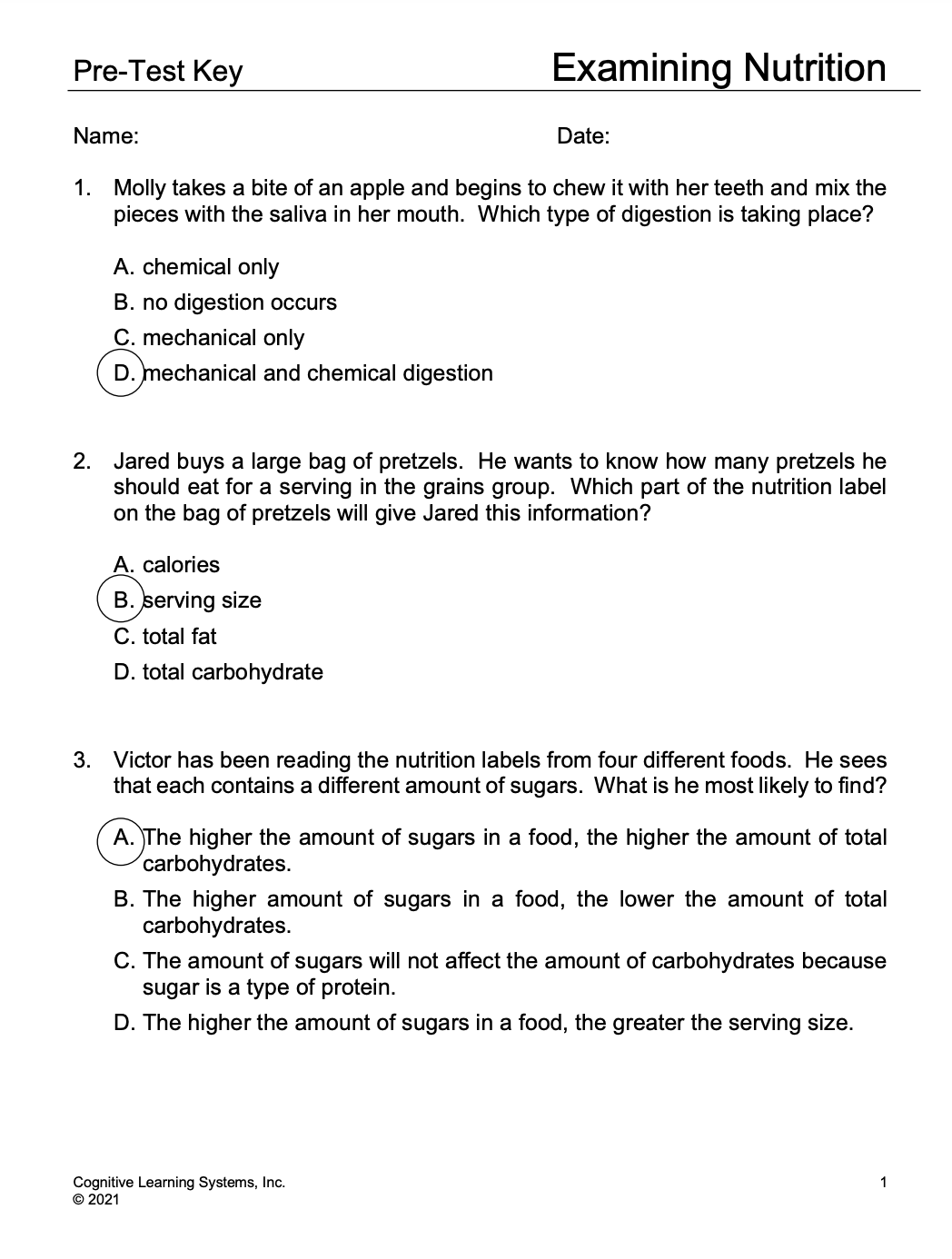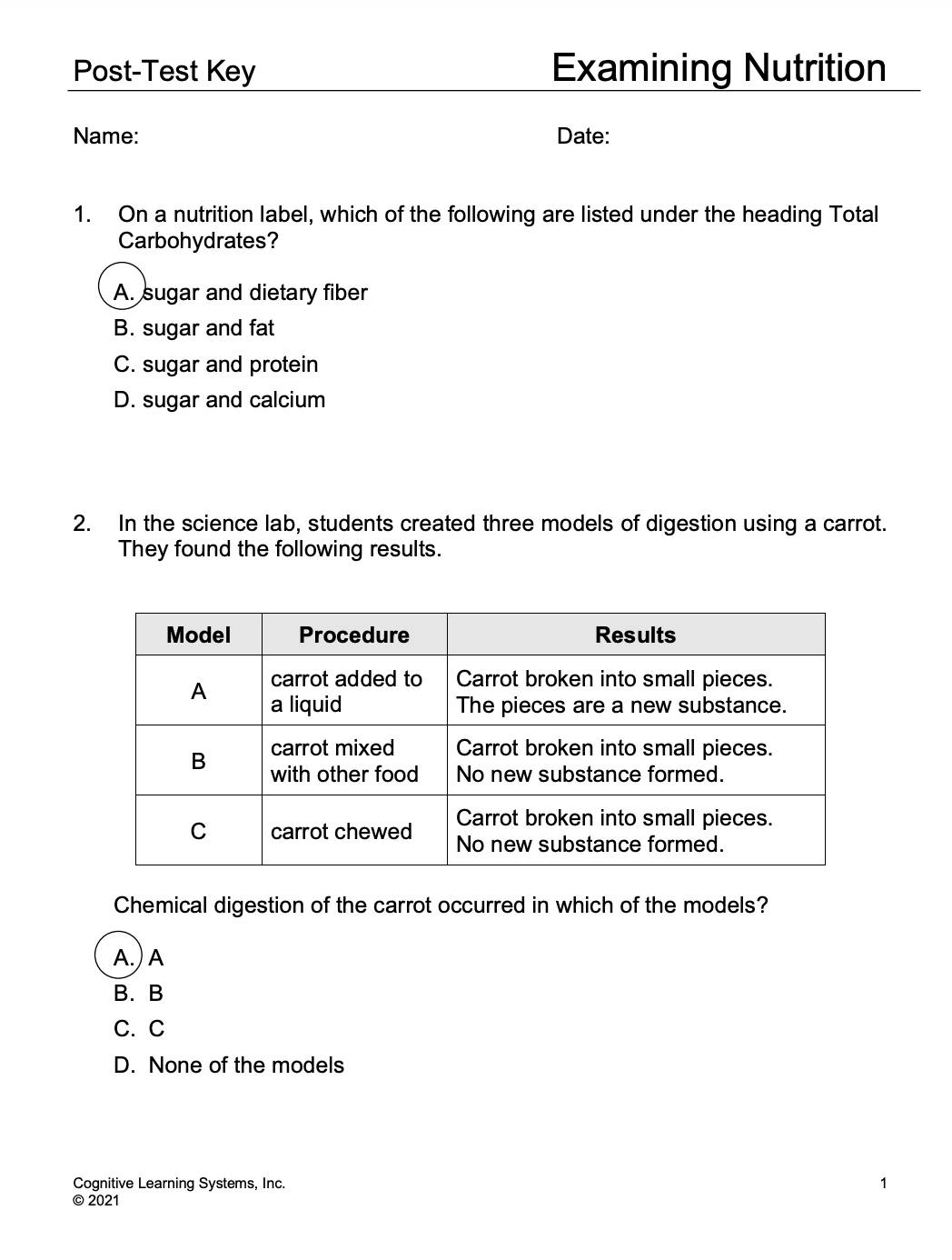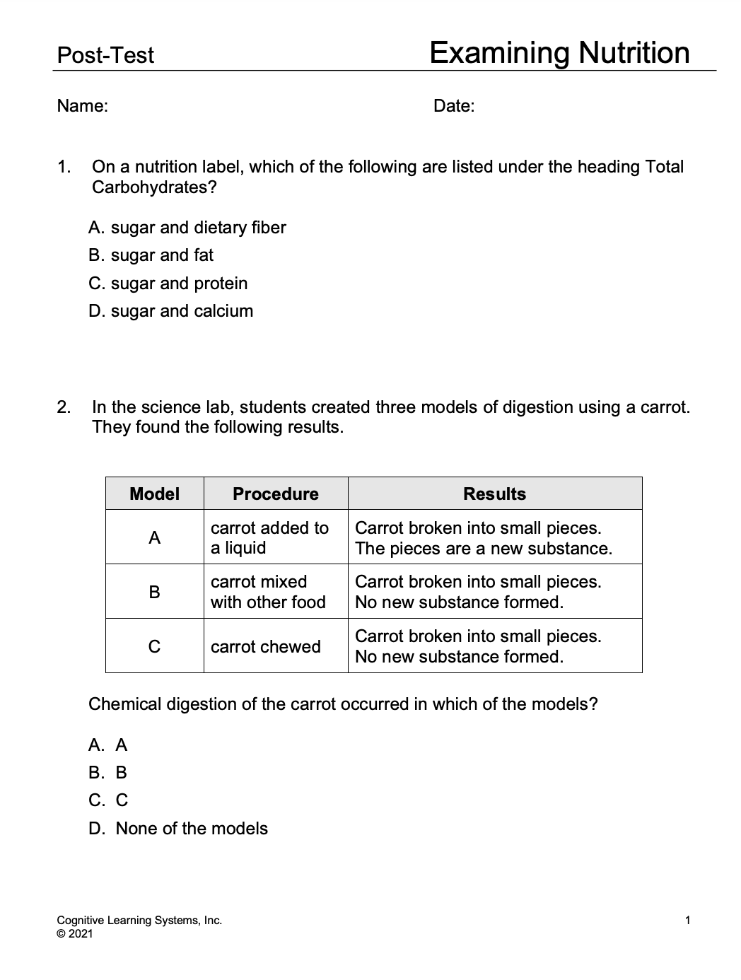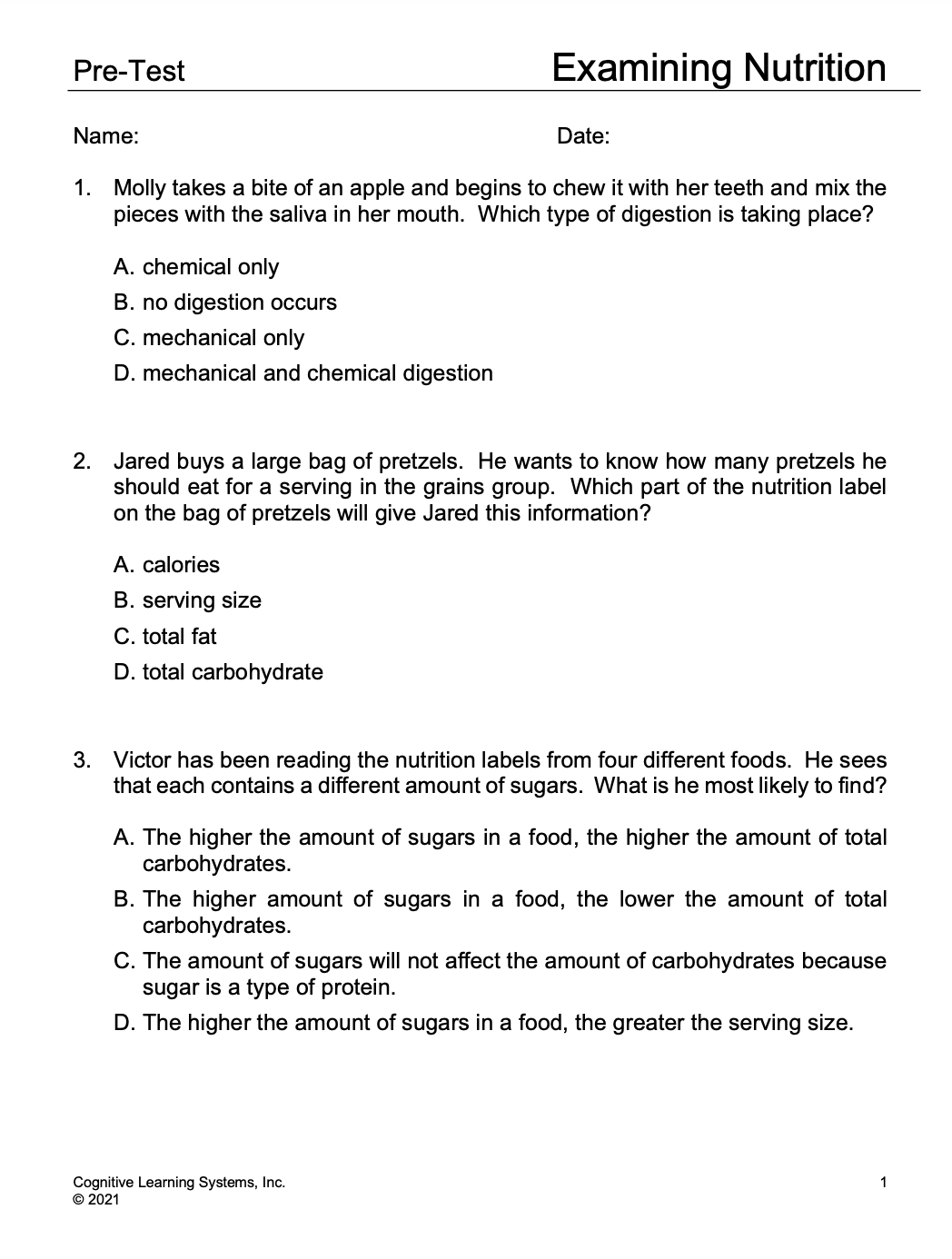 During Investigation Three, students will begin a more in-depth exploration of nutrients. They will be introduced to carbohydrates, one of the six classes of nutrients. Students will learn about sugars, starch, and dietary fiber, all different types of carbohydrates. Through the use of nutrition labels, students will examine the carbohydrate content of several food items and will measure the amount of total carbohydrates and sugars in various food items from different food groups.