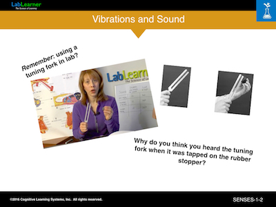 This slide is included simply to remind students that they used a tuning fork in the lab to produce sound. It asks the important question, “Why do you think you heard the tuning fork when it was tapped on the rubber stopper?“. The answer, of course, is that tapping the tuning fork caused it to vibrate.