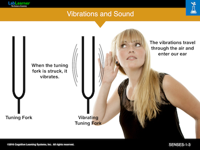 This slide graphically shows that tapping the tuning fork causes it to vibrate. It further goes on to say that the vibrations from the tuning fork travel through the air and enter our ears.