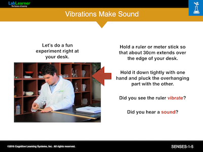 This slide describes the first of two experiments that students may do at their desks or the teacher may choose to do as a demonstration. If the latter, be sure that each student is able to come close enough to both hear the sound produced and see the vibration of the ruler or meter stick.