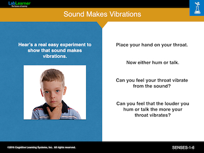 This final slide describes a very simple experiment that each student can do at his or her desk. When holding one’s hand on one’s throat in silence, no vibration is felt because no sound is being produced. Upon either humming or simply talking, students will feel the vibrations coming from their throats as well as hear the sound produced.