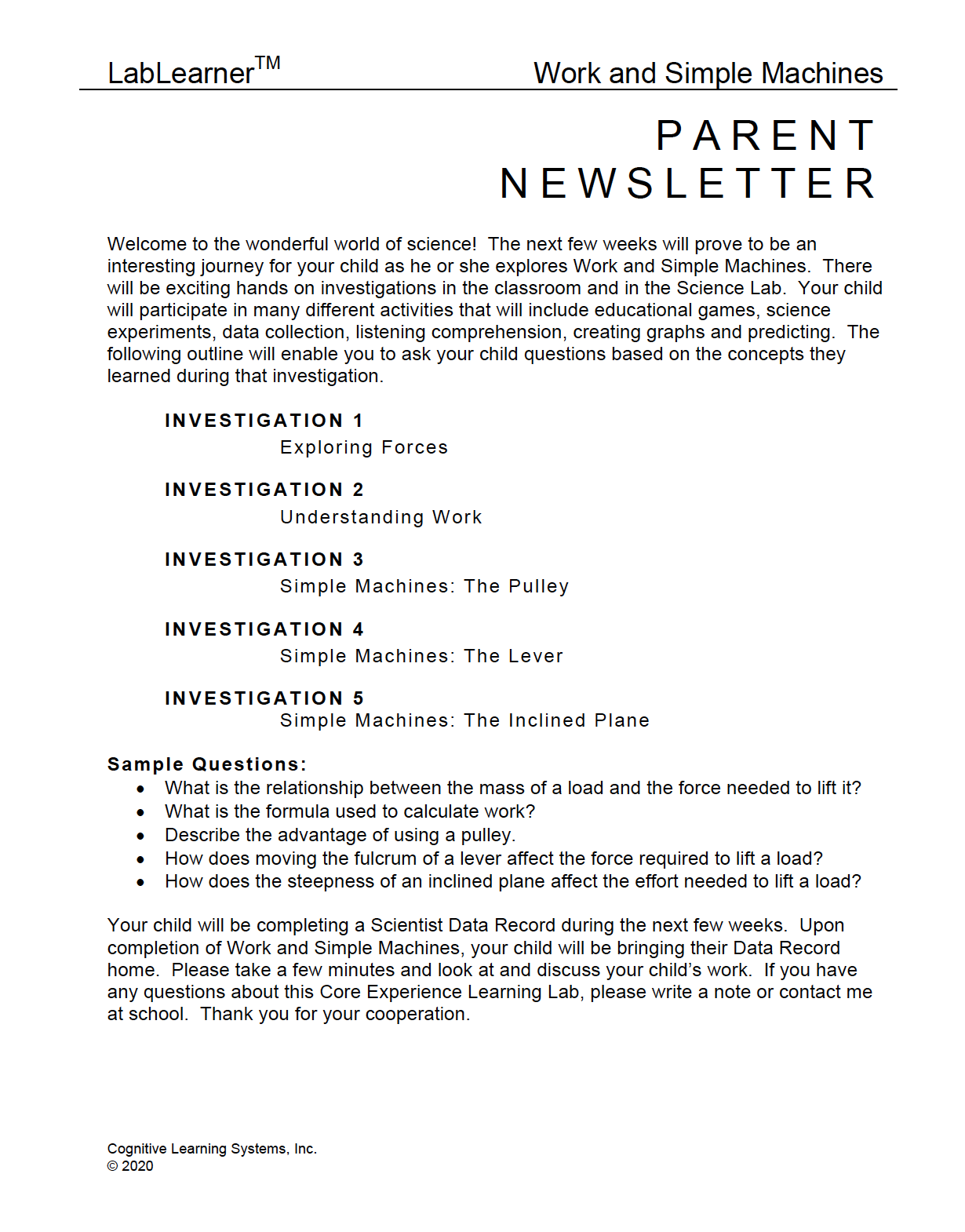 Investigation Six consists of a performance assessment designed to evaluate students’ understanding of the science concepts addressed in the first five Investigations of the Core Experience. During this exploration, students will design and implement the use of a simple machine.