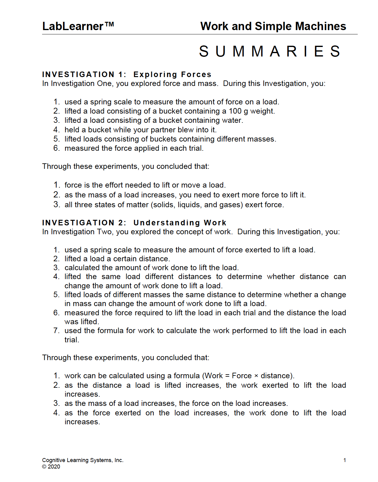 Investigation Two guides students to explore the concept of work. Students perform several trials in which they vary the mass of the load and the distance each load is lifted, discovering the relationship between force, distance, and work. To further investigate this relationship, students use the formula Work = Force x distance to calculate work.