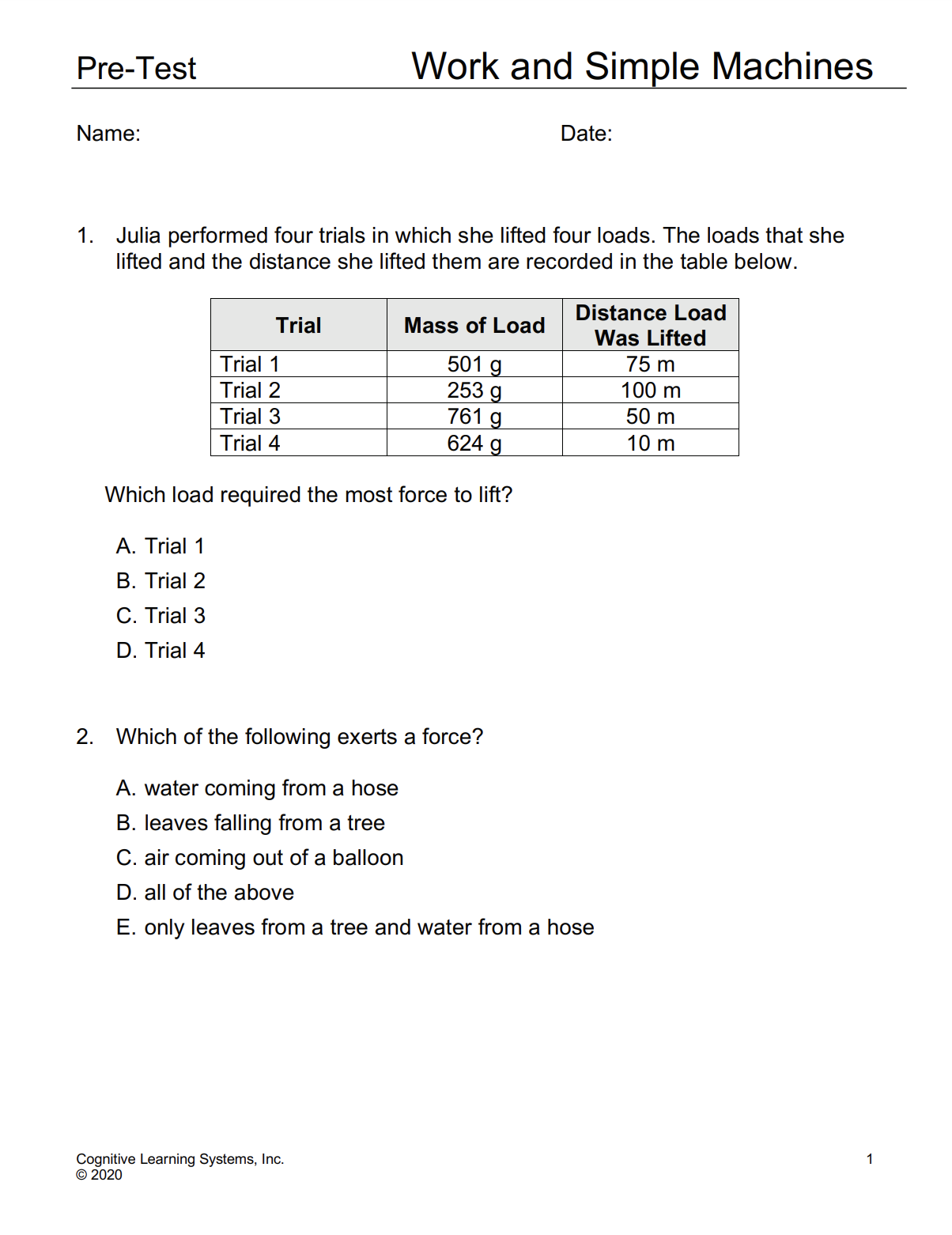 In Investigation One, students will explore the concept of force as the effort needed to lift or move a load. Students will investigate the force exerted by solids, liquids, and gases and will vary the mass of the load in order to determine the relationship between mass and force exerted to lift a load.