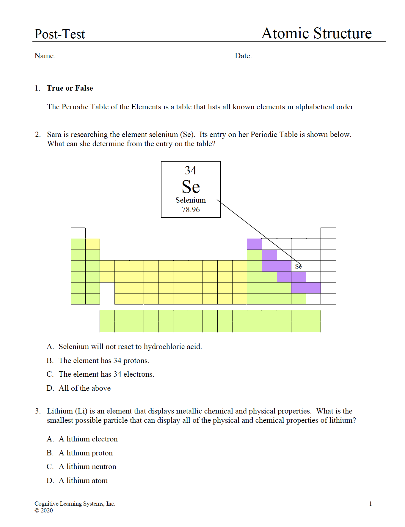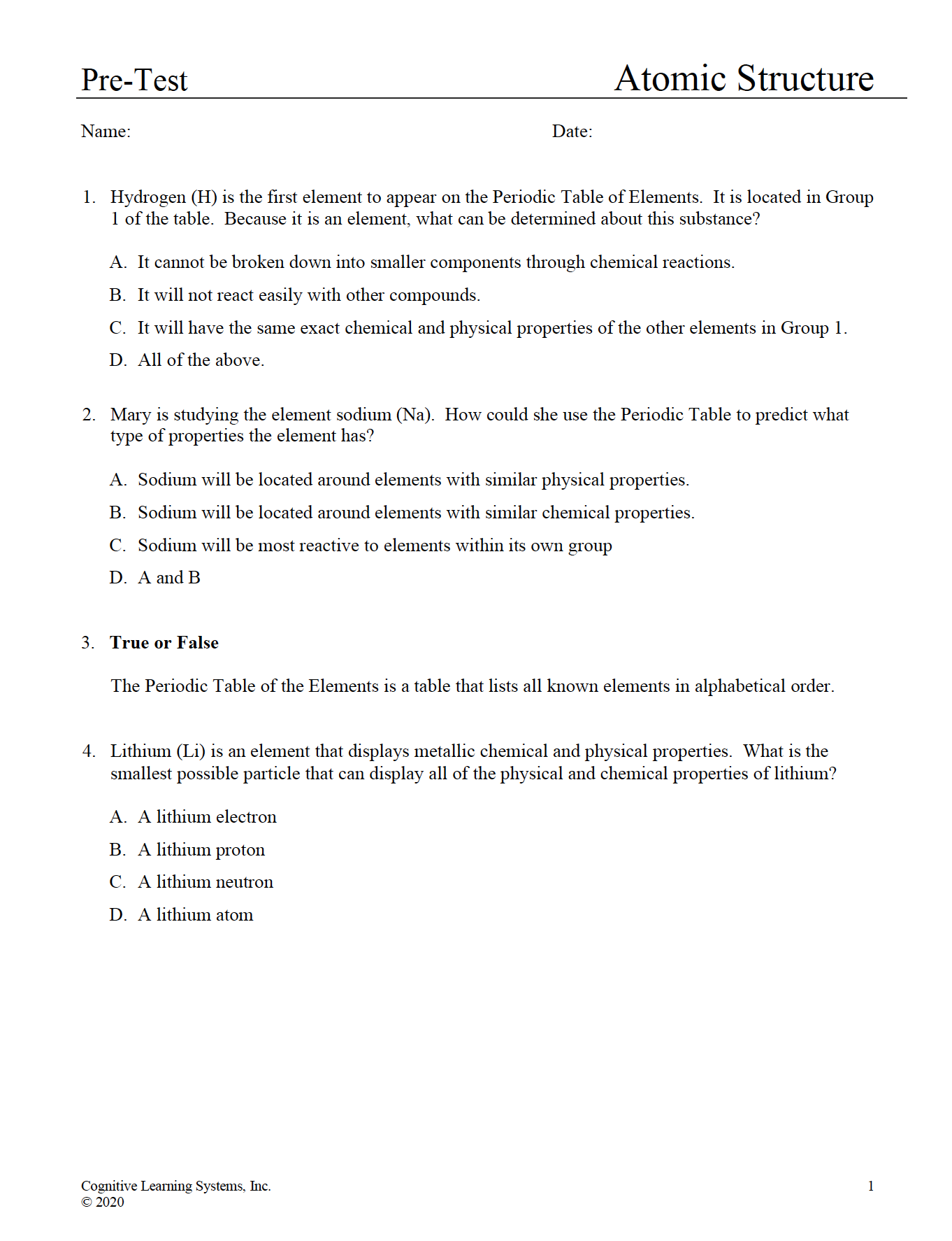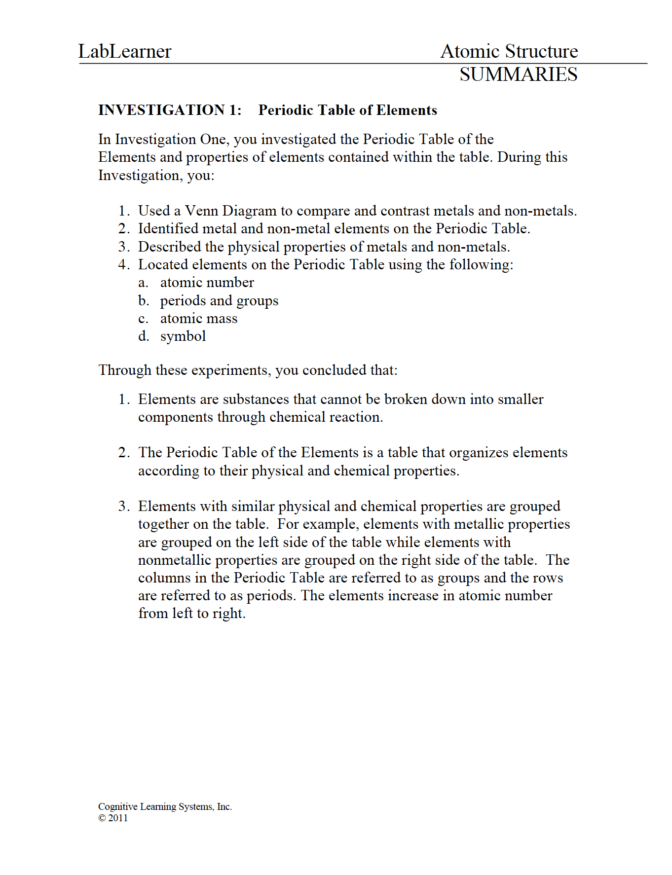 Atomic Structure: Investigation 1 - Periodic Table of Elements