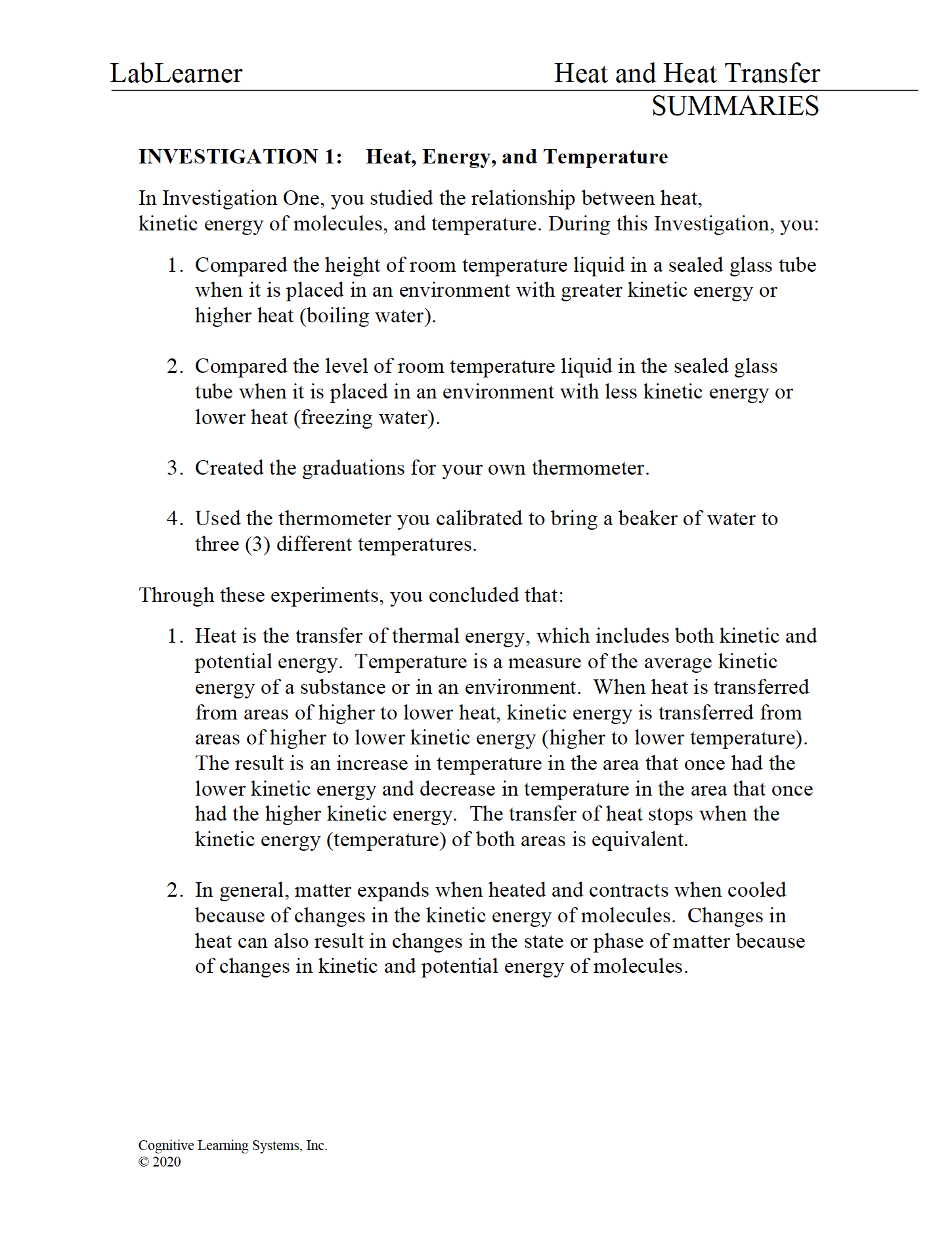 In Investigation One, you will study the relationship between heat, the kinetic energy of molecules, and temperature. During this Investigation, you will: