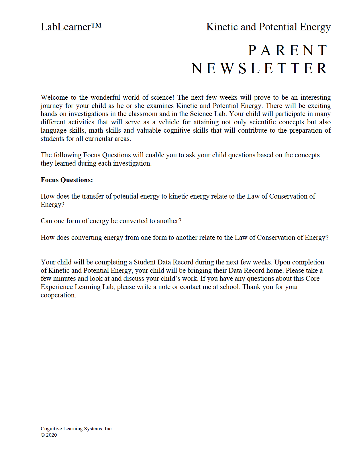 In Investigation Three, you will continue to explore forms of energy by analyzing the relationship between potential and kinetic chemical energy and the Law of Conservation of Energy. During this Investigation, you will: