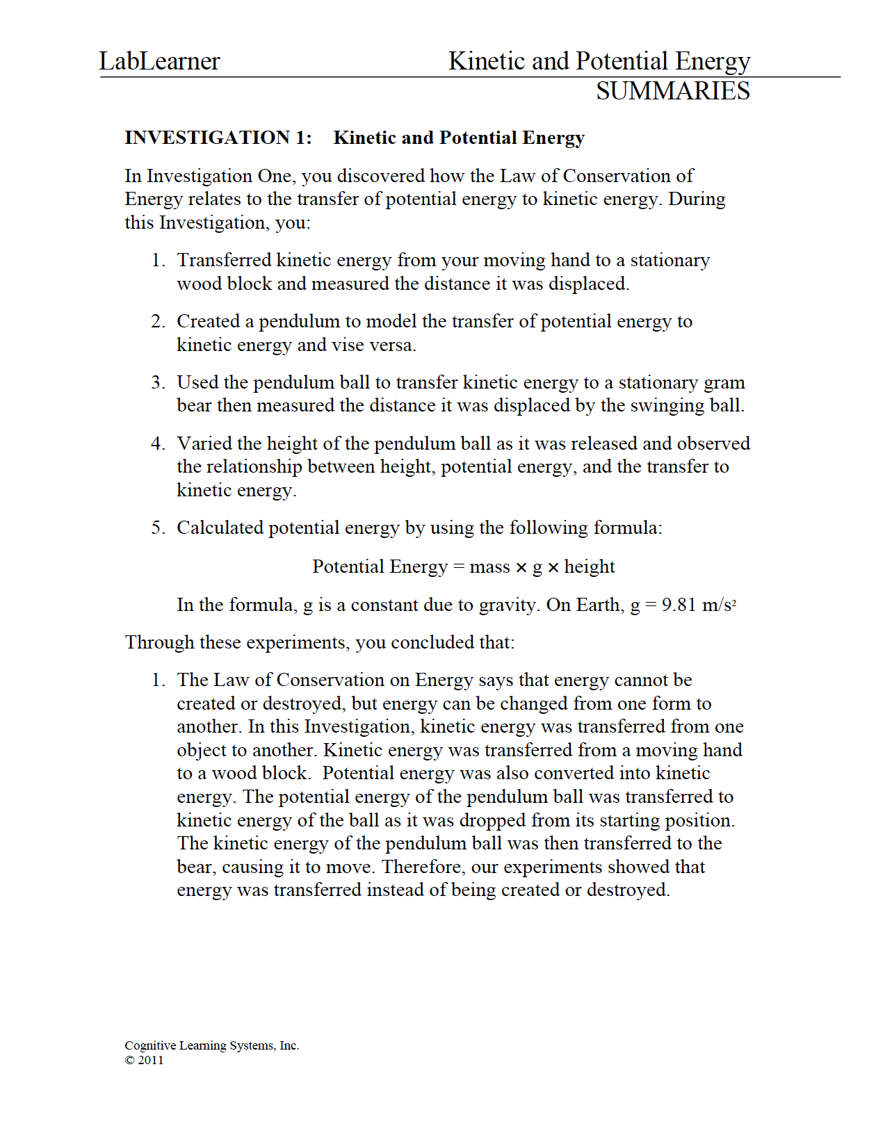 In Investigation One, you will discover how the Law of Conservation of Energy relates to the transfer of potential energy to kinetic energy. During this Investigation, you will: