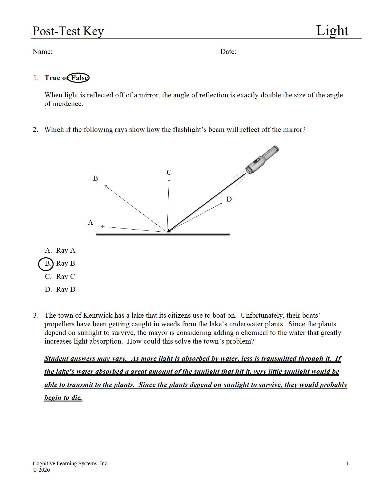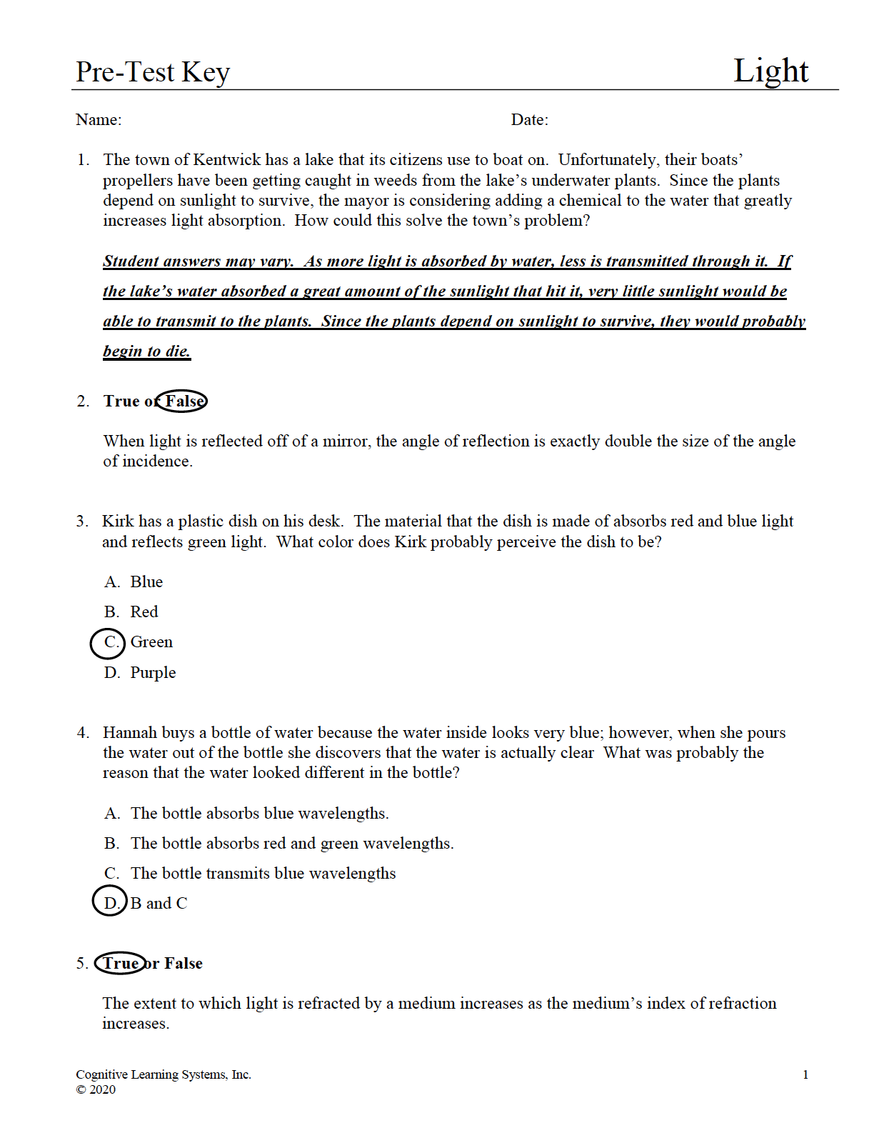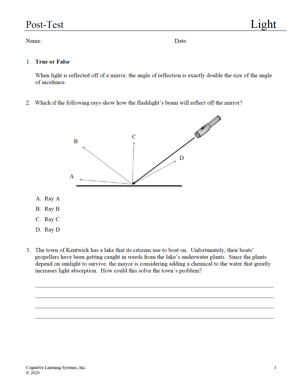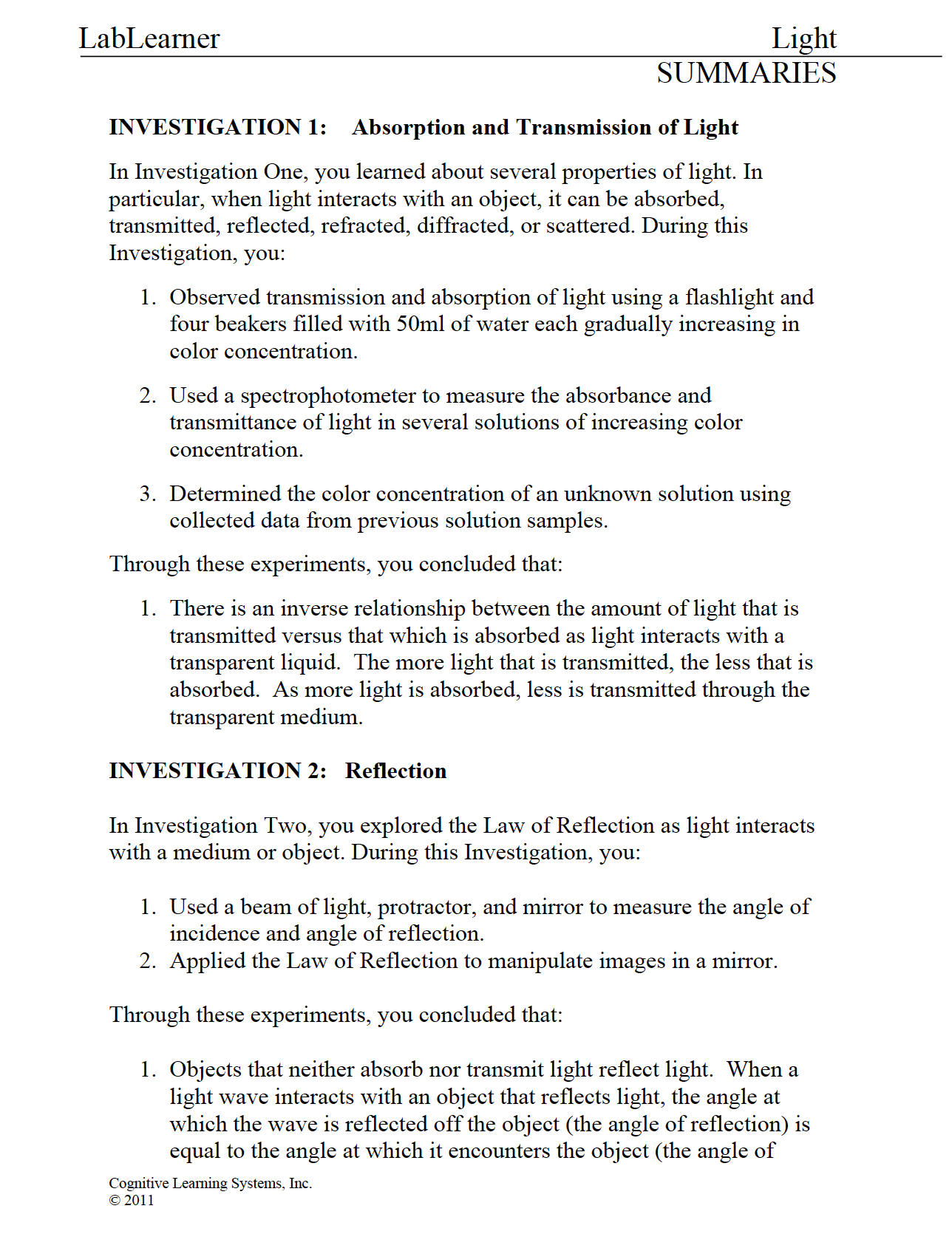 In Investigation One, you will learn about several properties of light. In particular, when light interacts with an object, it can be absorbed, transmitted, reflected, refracted, diffracted, or scattered. During this Investigation, you will: