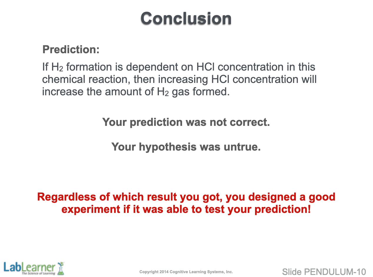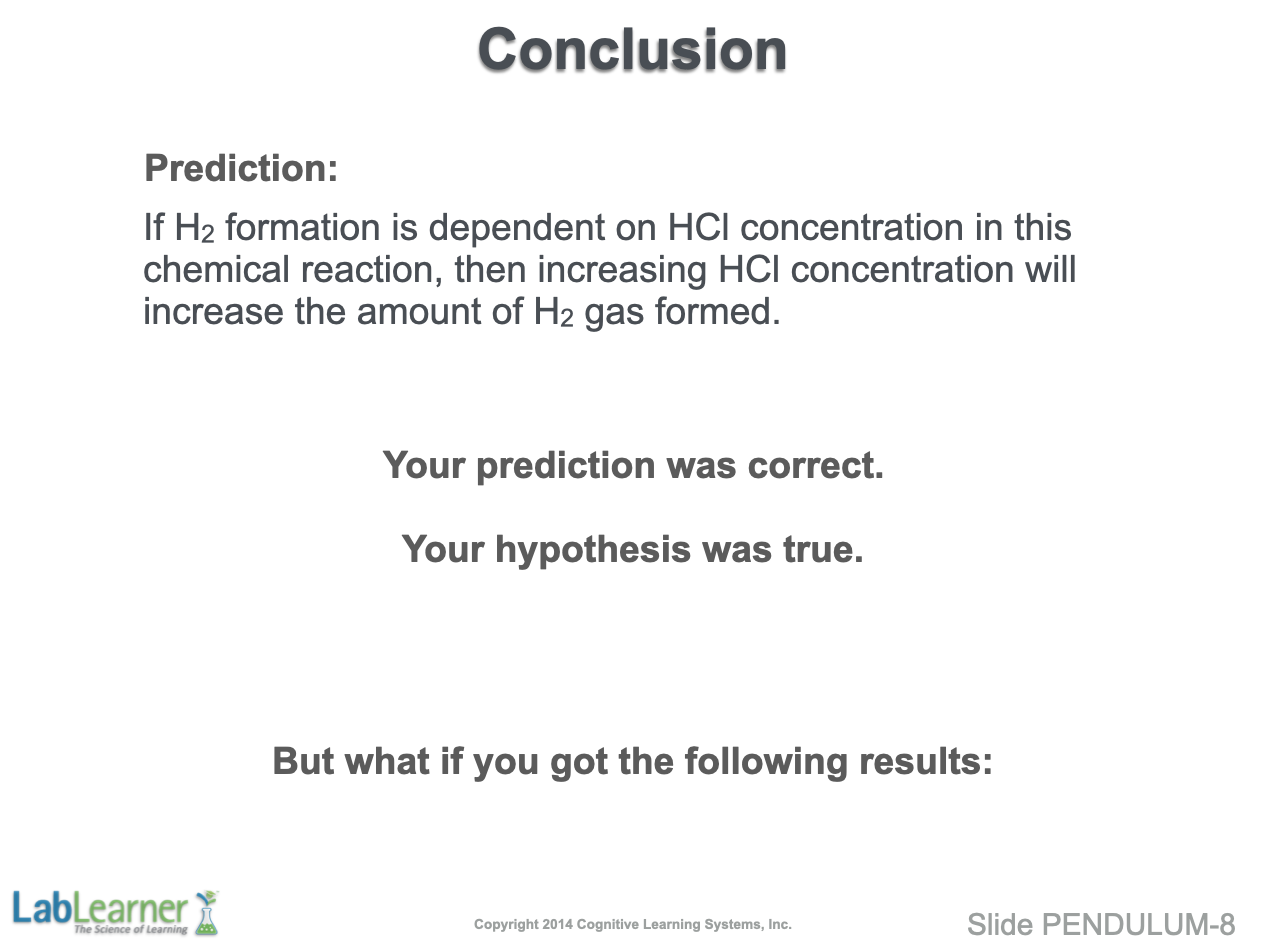 - This slide simply states that, based on the experimental results presented on the previous slide, our prediction was correct. Therefore, we can now remove the “If/Then” elements of the prediction and state: