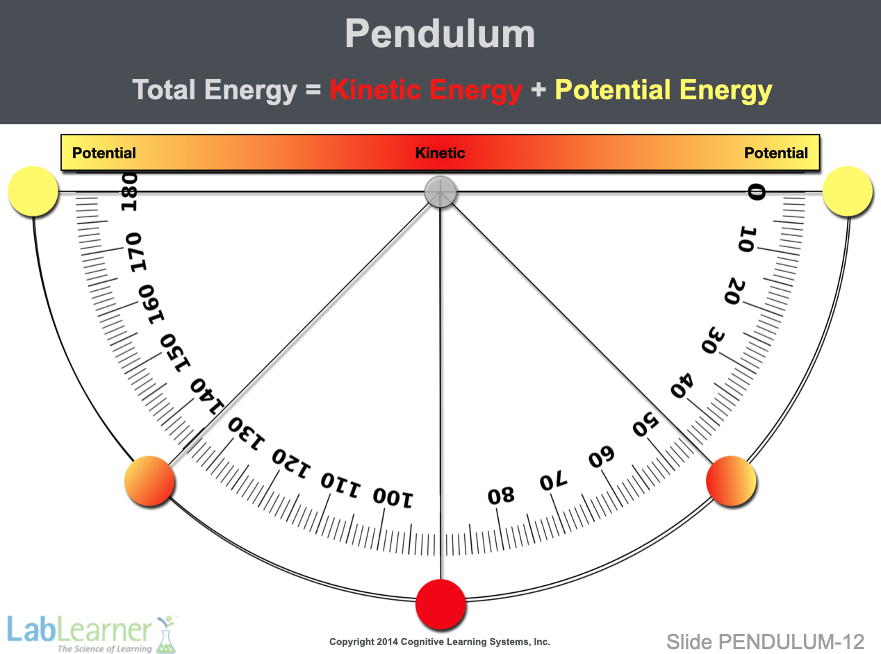 - Note that the color of the pendulum switches from yellow to red as it moves from full potential energy to full kinetic energy. At the intermediate positions, the pendulum is a mix of yellow and red indicating the mix of potential and kinetic energy.
