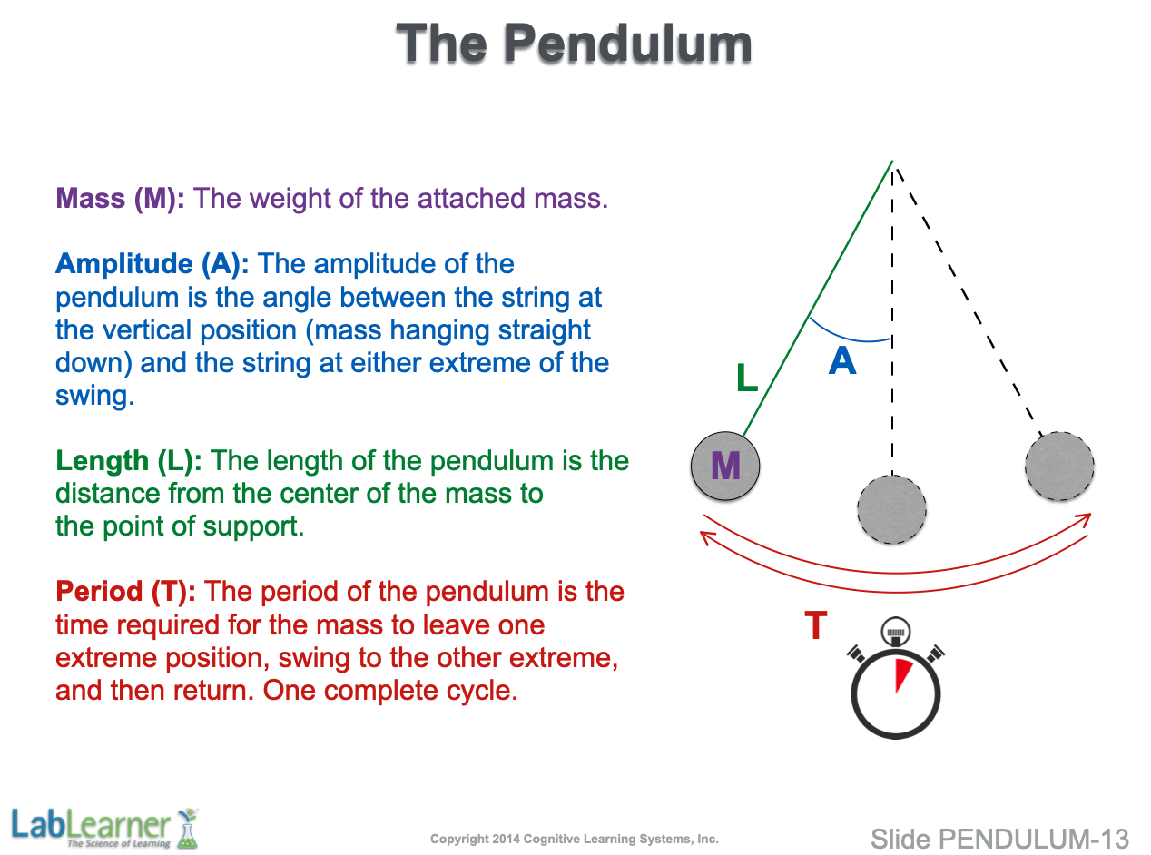 - The amplitude (A) is a measurement of the angle between the position of the mass just prior to release and the perpendicular. This is a second variable that students may alter in designing their experiments.