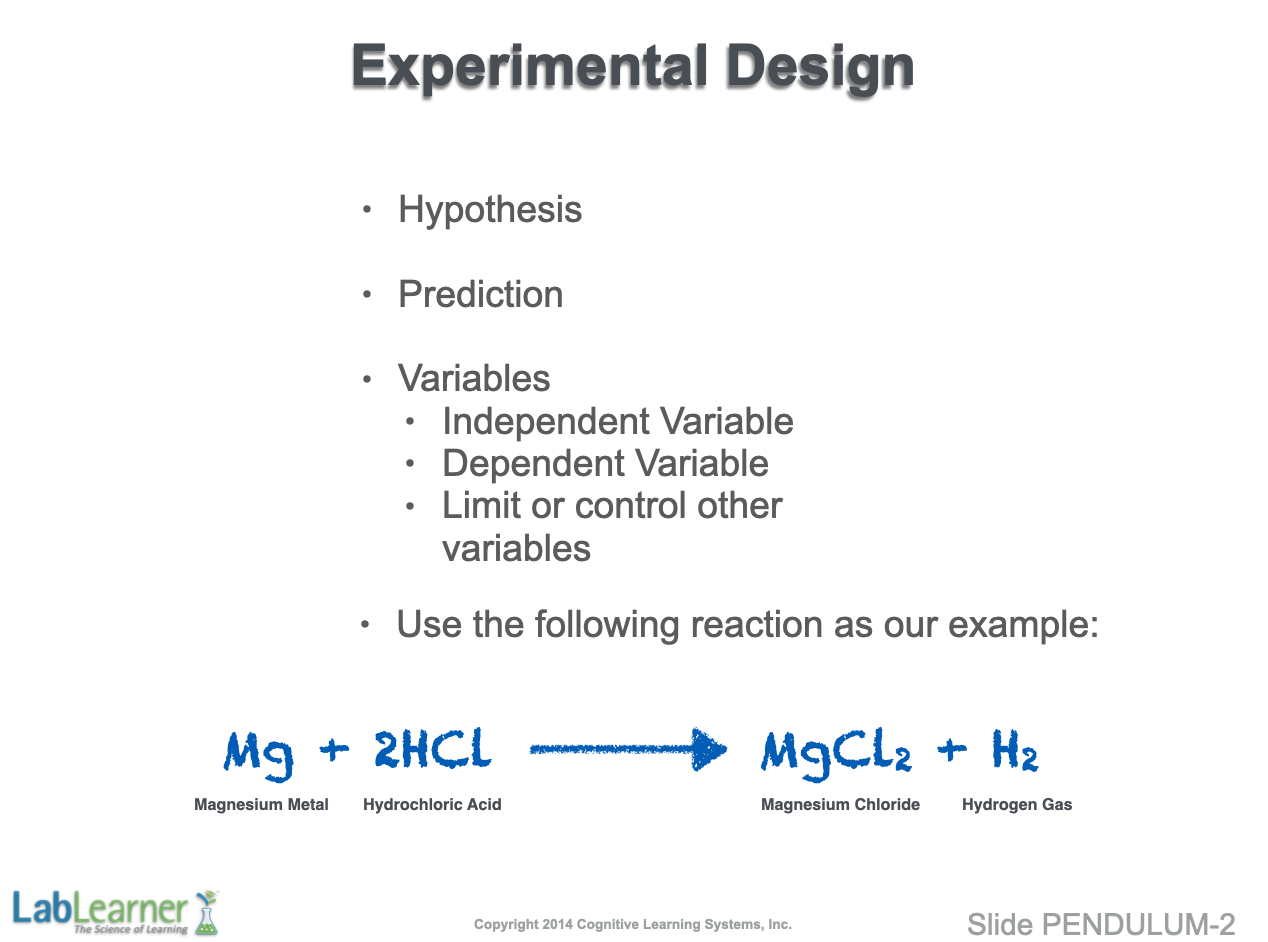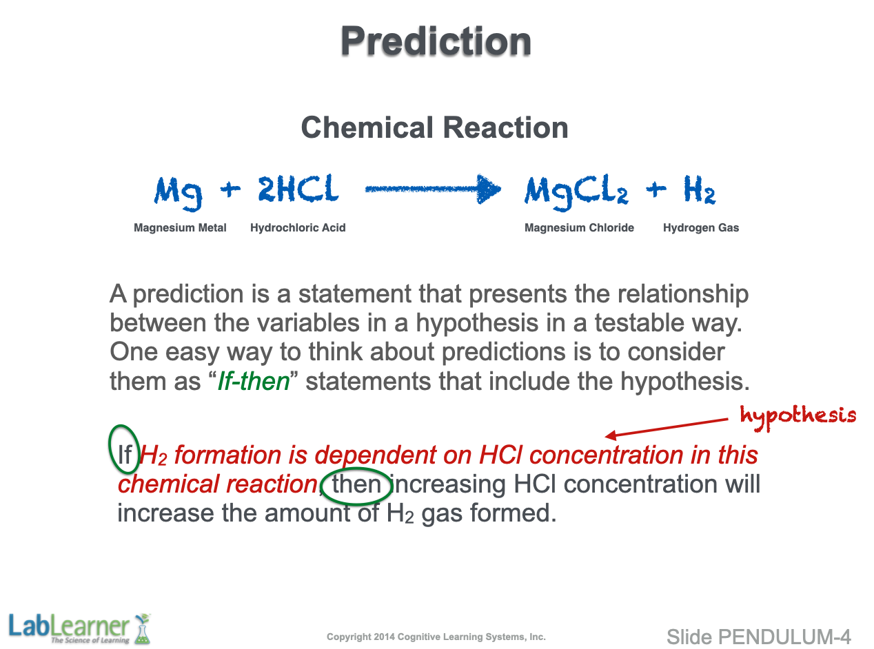 Note: Obviously, in another hypothesis/prediction/experiment scenario, we could hold the amount of HCl constant and make the amount (mass) of Mg metal our independent variable. We could then test the effect of this variable on the dependent variable, which would remain H2 gas formation.