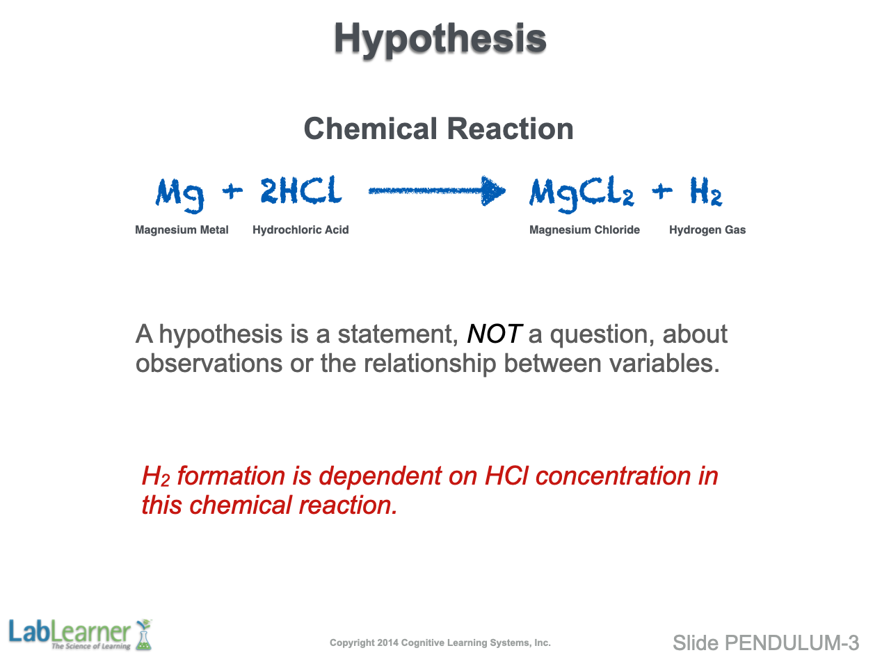 - This slide introduces the concept of a hypothesis. A hypothesis is a statement about the relationship between observed variables. It is NOT a question. This is a common mistake students make. For example, a terrible hypothesis related to our example reaction might be: