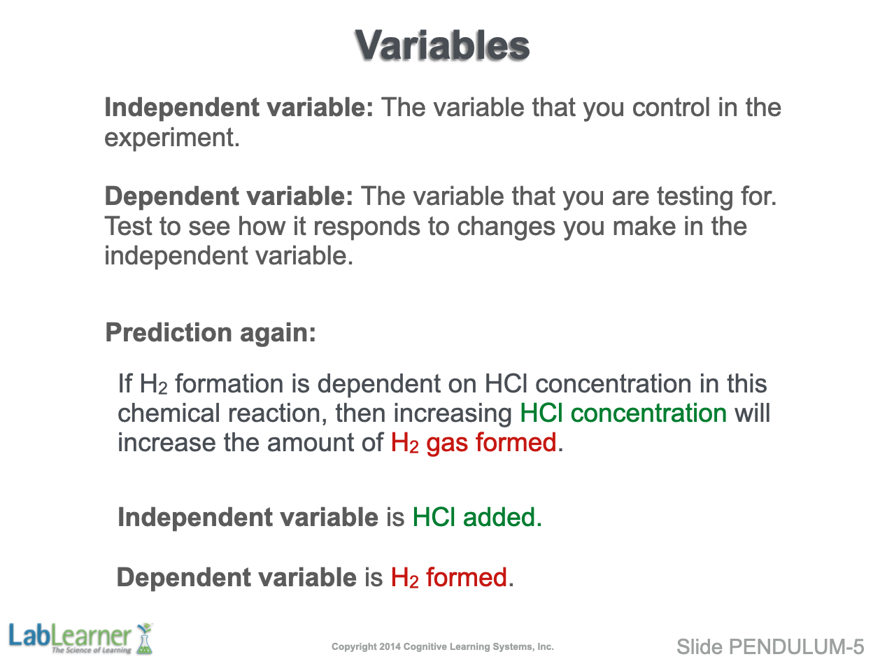 - The independent variable in our original prediction is the HCl added, while the dependent variable is the H2 gas formed. Thus, we will want to change the amount of HCl we add to the reaction and measure the effect these changes have on the amount of H2 gas formed.