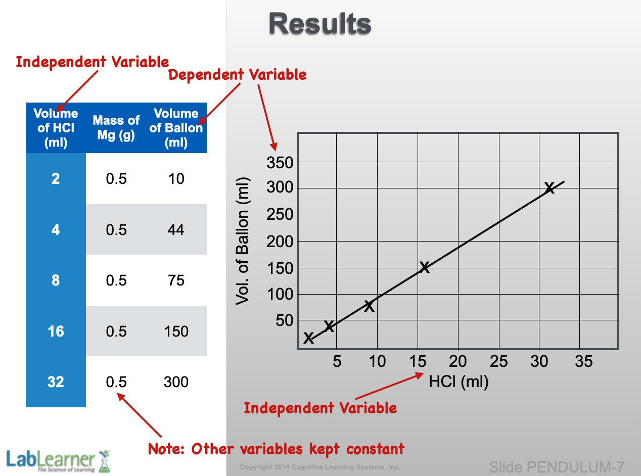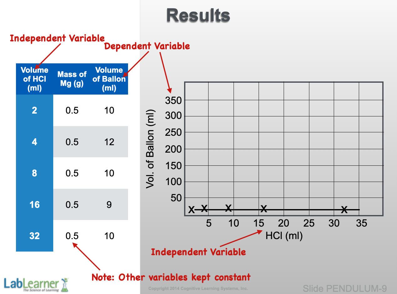 - This slide presents the hypothetical results of the experiment that we designed and conducted in the previous slides. On the left is the data table from which the graph on the right was constructed. Notice the volumes of HCl (independent variable) that were chosen and that the other component of the reaction, the magnesium metal, was kept constant at 0.5g.