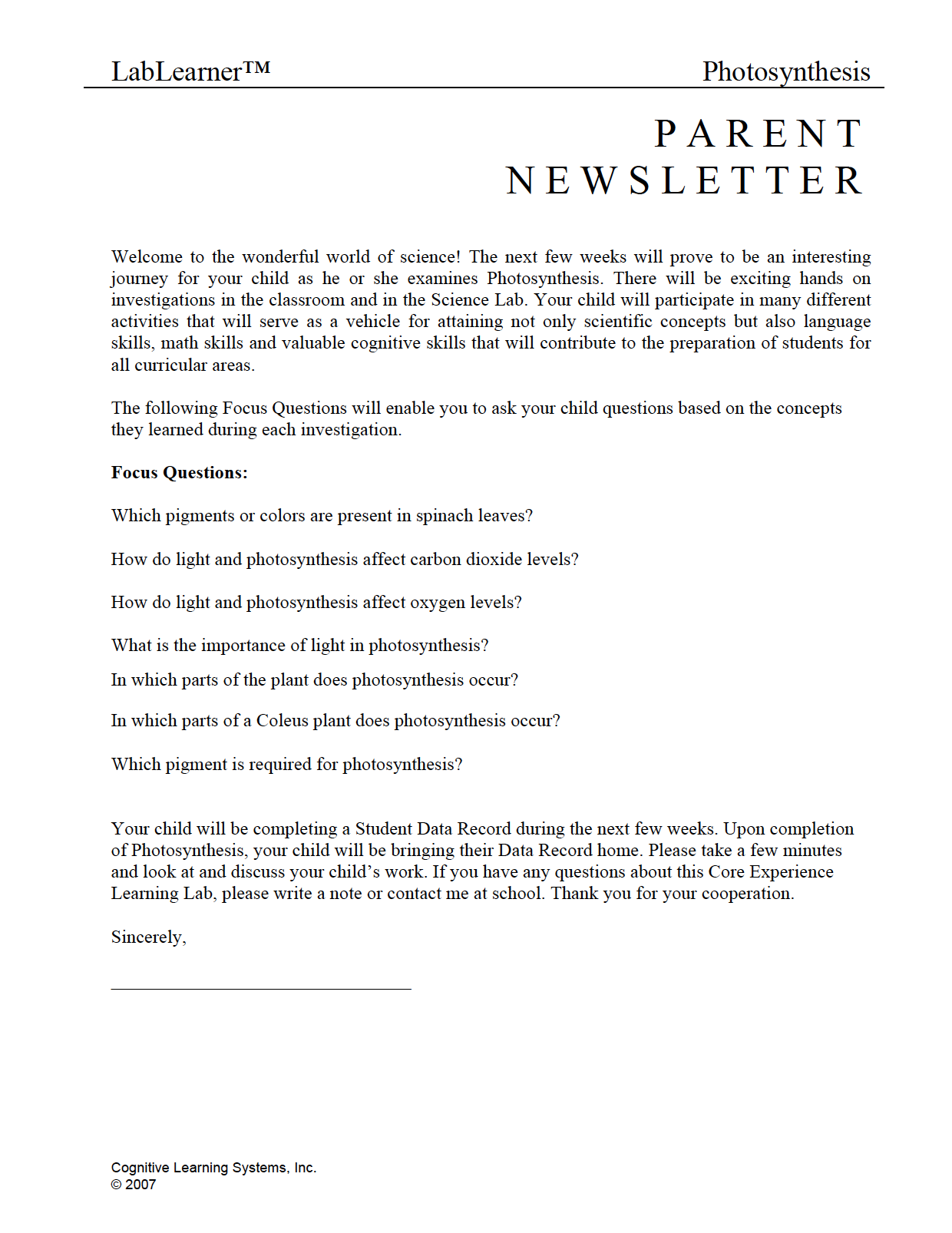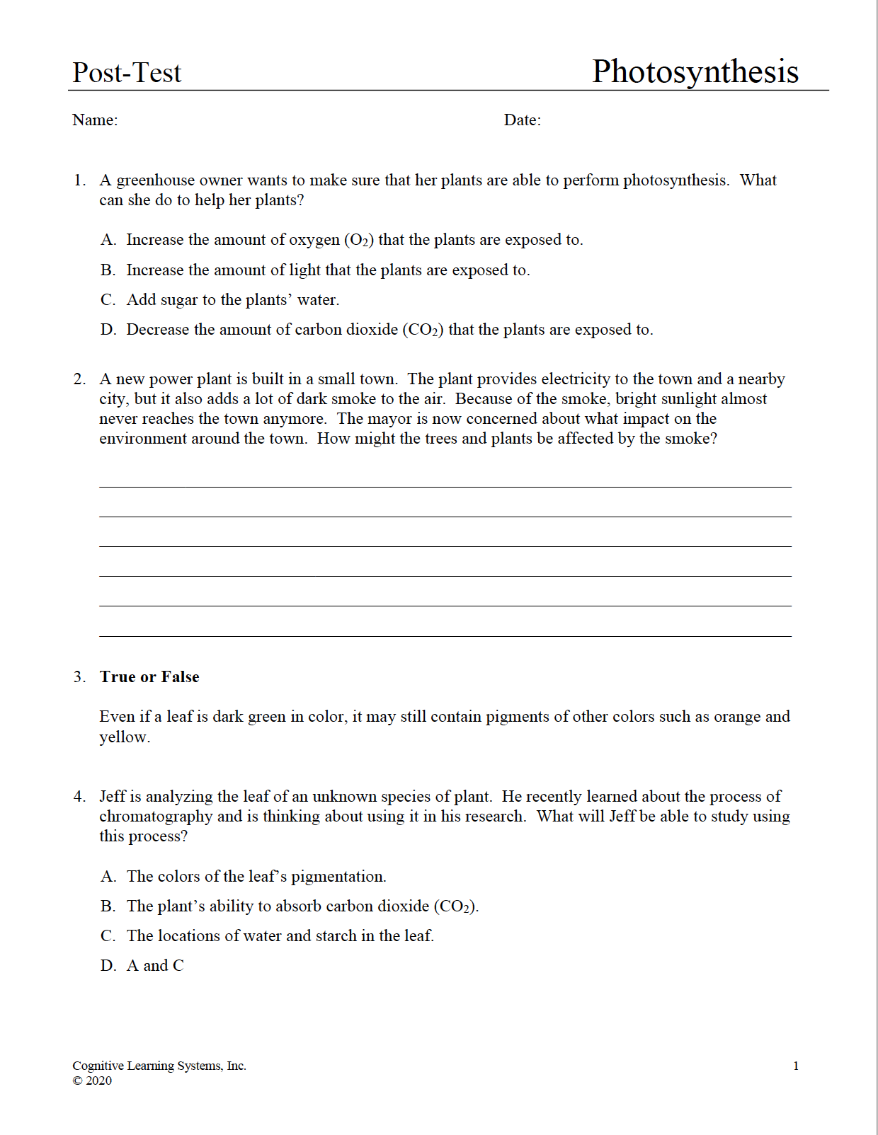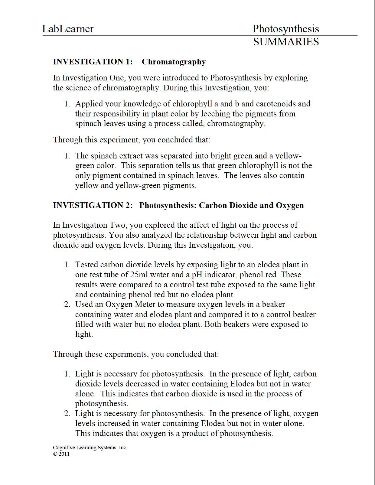 Photosynthesis: Investigation 2 - Carbon Dioxide and Oxygen