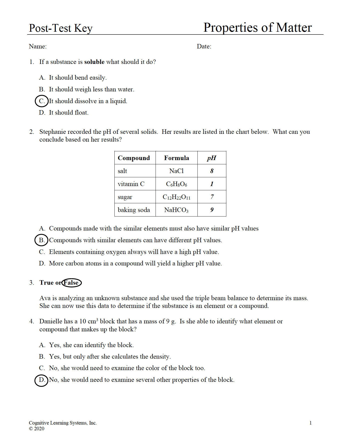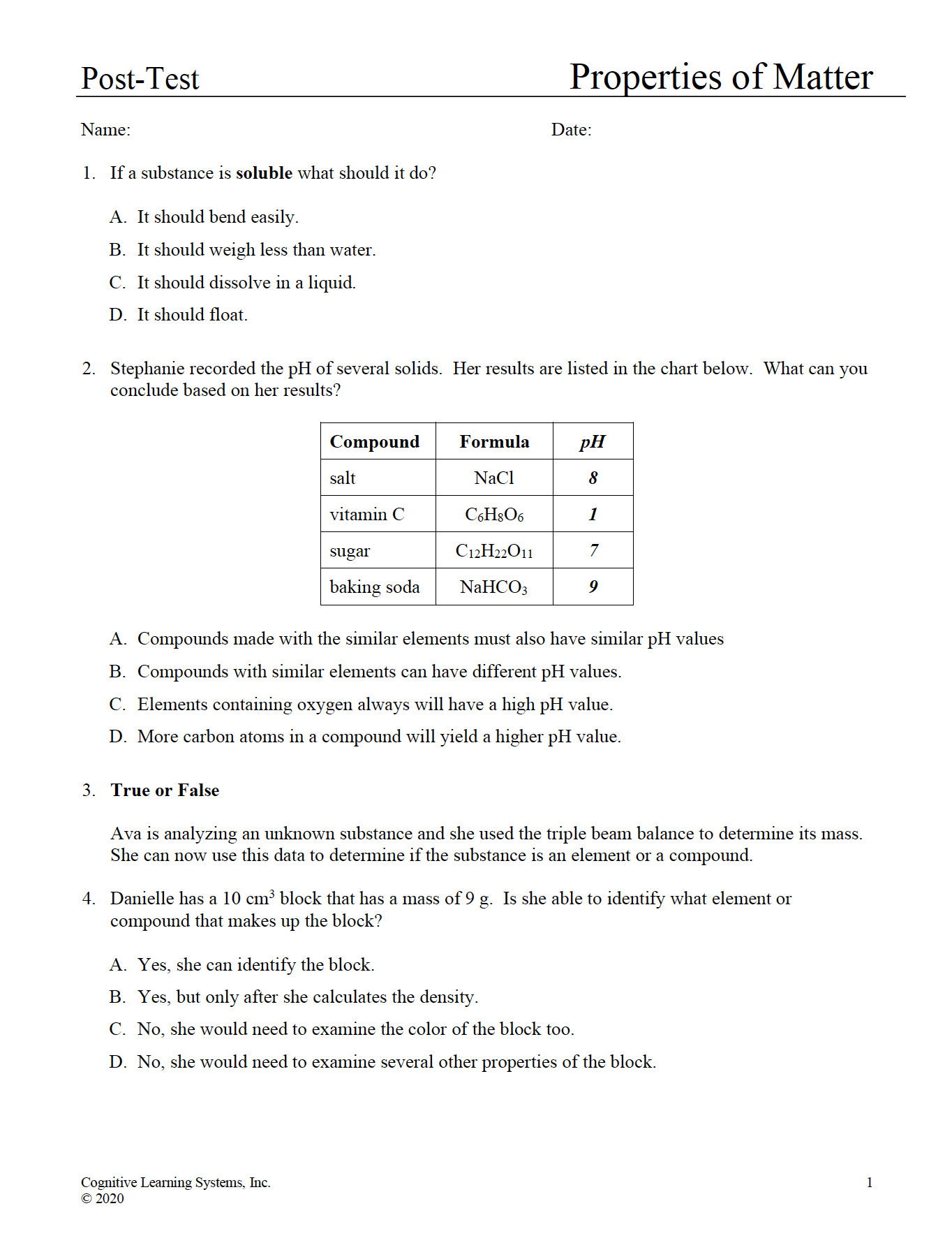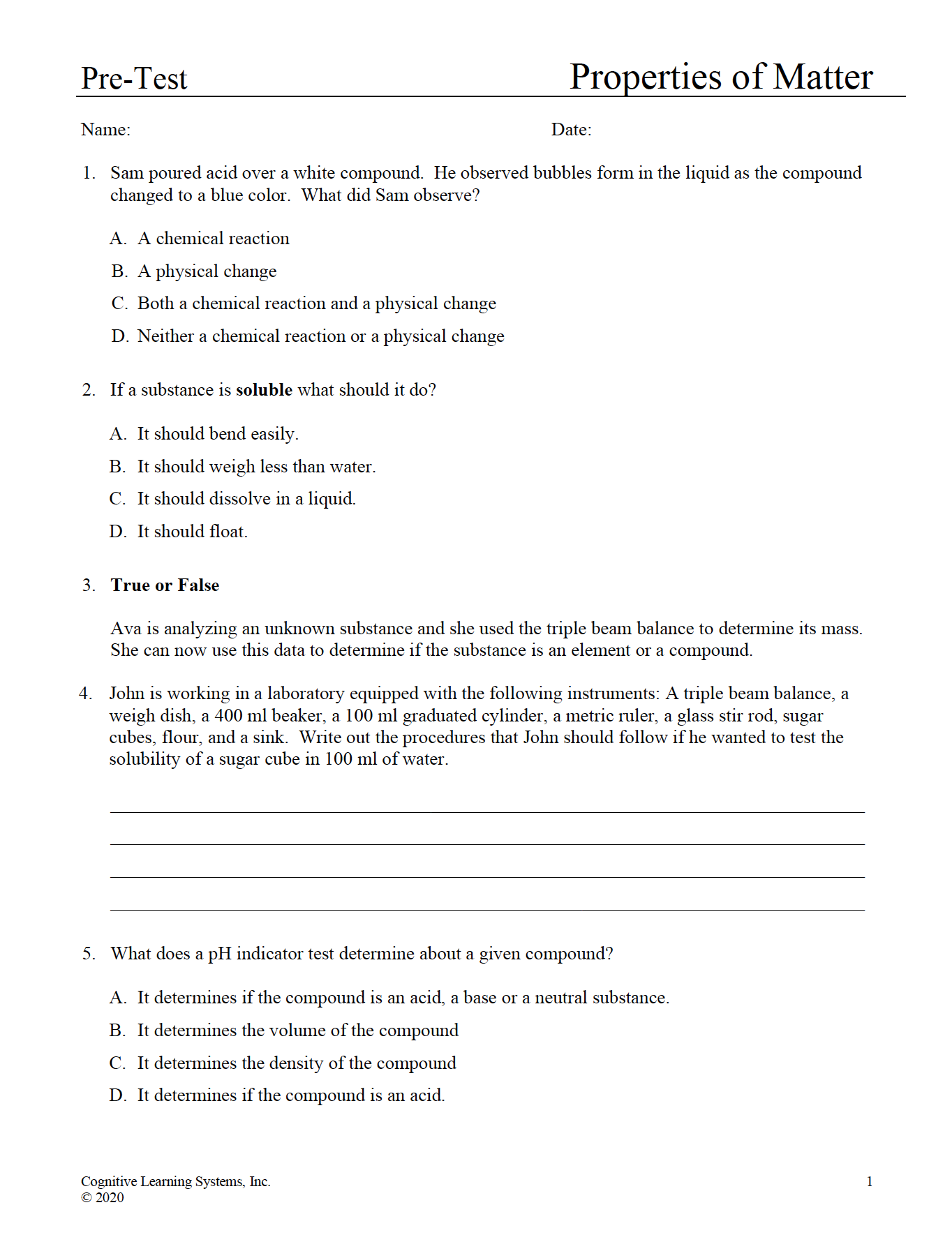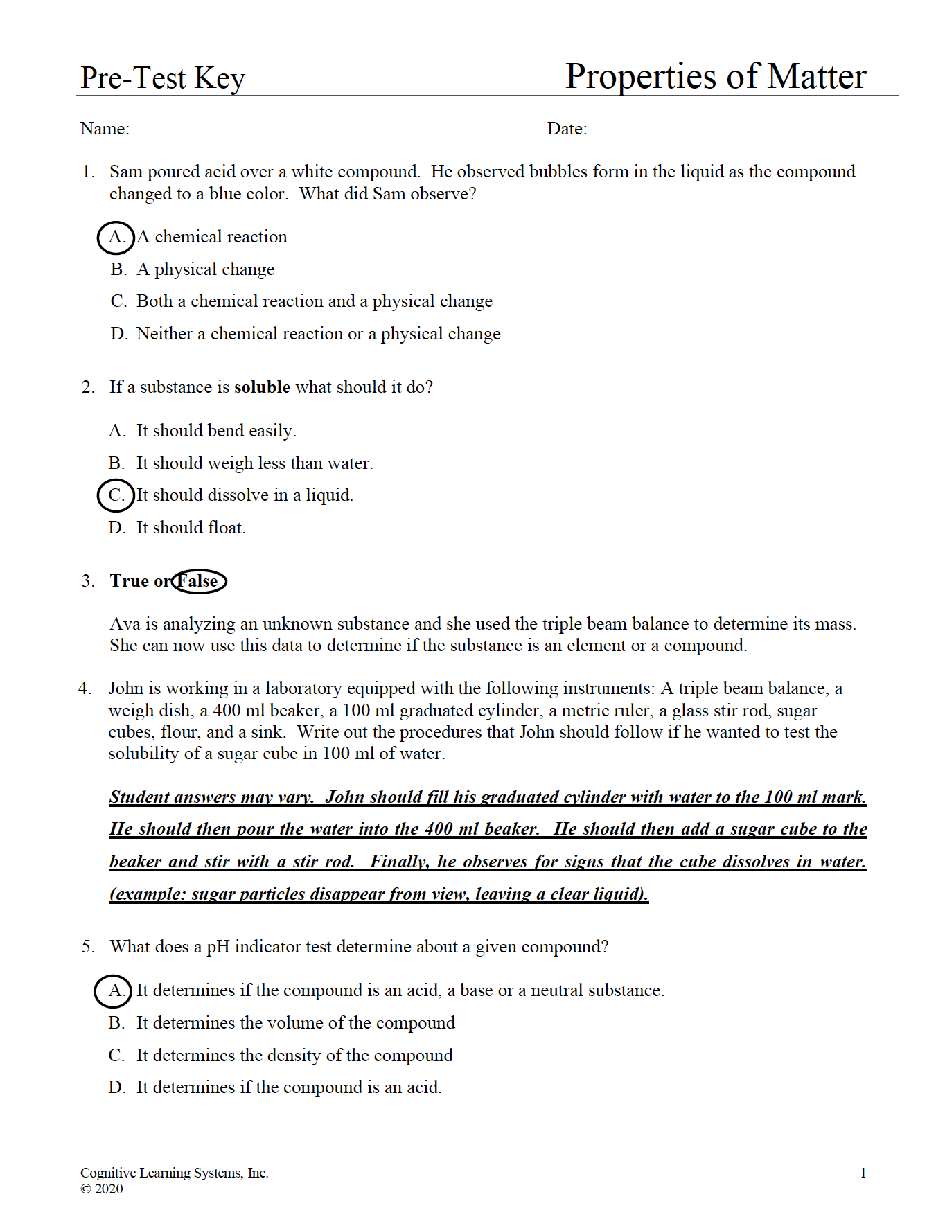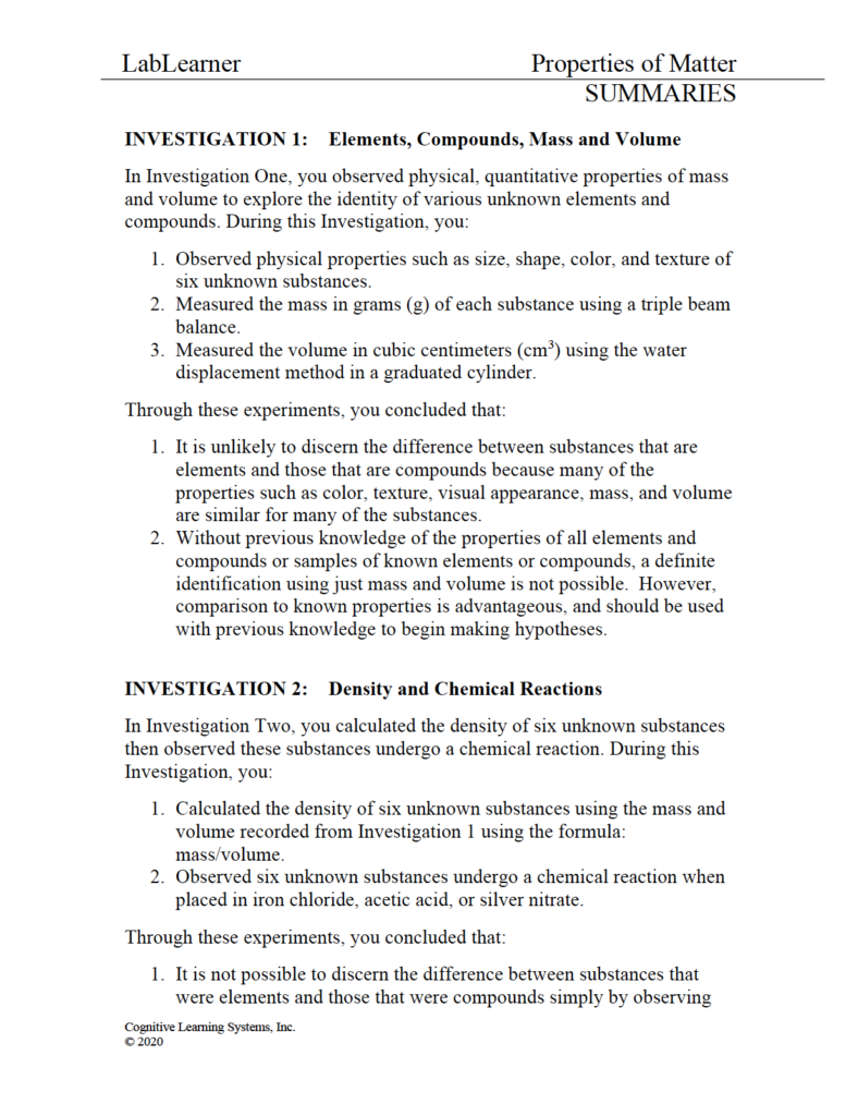 Properties of Matter: Investigation 1 - Elements, Compounds, Mass, and Volume