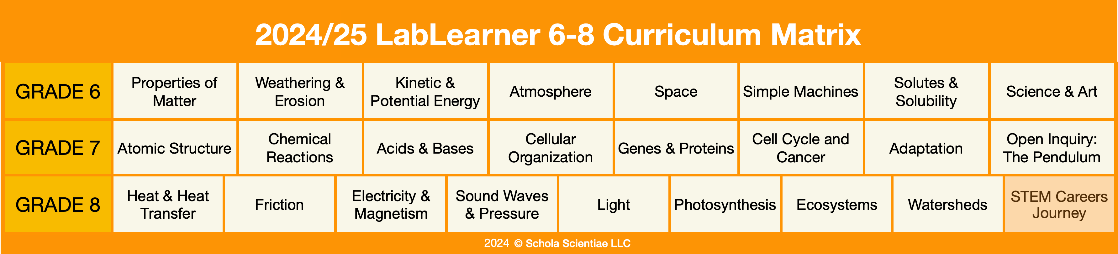 This is the LabLearner Middle School Curriculum Matrix. for the 2024/25 school year. There have been no changes from the 2023/24 curriculum matrix.